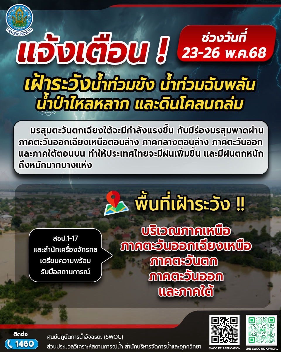 กรมชลฯ ประกาศเตือนเฝ้าระวังสถานการณ์น้ำท่วมขัง น้ำท่วมฉับพลัน น้ำป่าไหลหลาก วันที่ 23 – 26 พ.ค 68