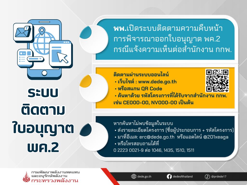 กรมพัฒนาพลังงานทดแทนและอนุรักษ์พลังงาน แจ้งช่องทางติดตามความคืบหน้าการพิจารณาออกใบอนุญาต ให้ผลิตพลังงานควบคุม (พค.2)