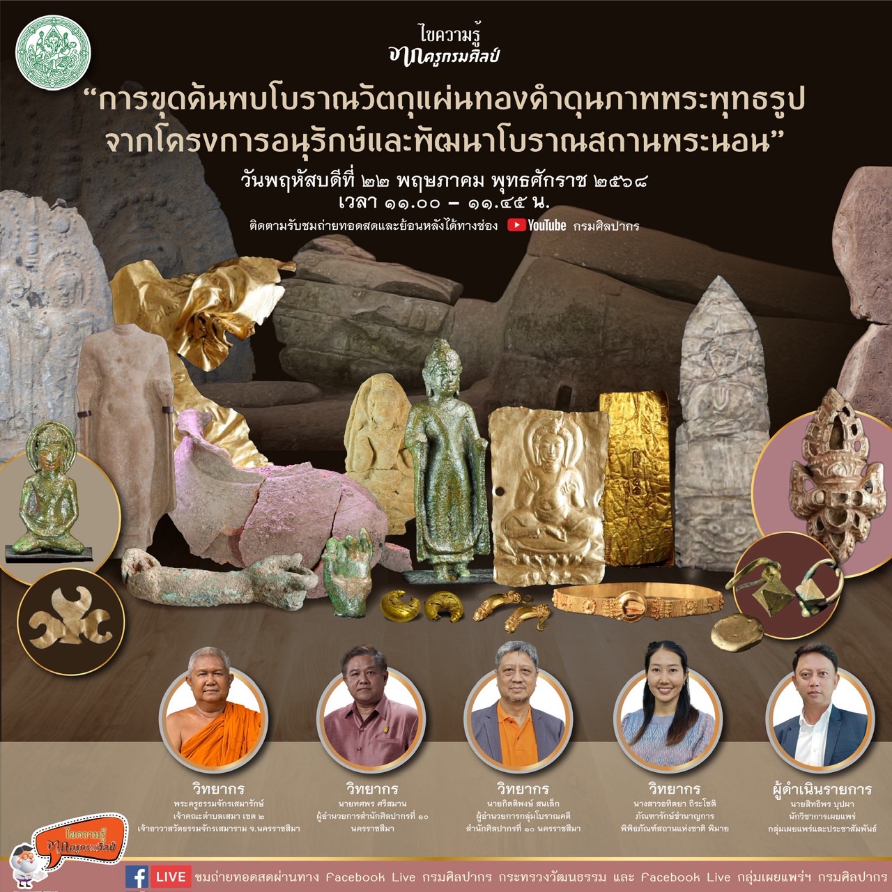 กรมศิลปากร ขอเชิญรับชมถ่ายทอด Facebook Live รายการไขความรู้จากครูกรมศิลป์ “การขุดค้นพบโบราณวัตถุแผ่นทองคำดุนภาพพระพุทธรูปจากโครงการอนุรักษ์และพัฒนาโบราณสถานพระนอน” วิทยากร พระครูธรรมจักรเสมารักษ์ เจ้าคณะตำบลเสมา เขต 2 เจ้าอาวาสวัดธรรมจักรเสมาราม จ.นครราชสีมา, นายทศพร ศรีสมาน ผู้อำนวยการสำนักศิลปากรที่ 10 นครราชสีมา, นายกิตติพงษ์ สนเล็ก ผู้อำนวยการกลุ่มโบราณคดี สำนักศิลปากรที่ ๑๐ นครราชสีมา และนางสาวอทิตยา ถิระโชติ ภัณฑารักษ์ชำนาญการ พิพิธภัณฑ์สถานแห่งชาติ พิมาย ผู้ดำเนินรายการ นายสิทธิพร บุปผา นักวิชาการเผยแพร่ กลุ่มเผยแพร่และประชาสัมพันธ์ ในวันพฤหัสบดีที่ 22 พฤษภาคม พุทธศักราช 2568 เวลา 11.00 – 11.45 น. ผู้สนใจสามารถติดตามชมได้ทาง Facebook Live : กรมศิลปากร กระทรวงวัฒนธรรม และ Facebook Live : กลุ่มเผยแพร่ฯ กรมศิลปากร