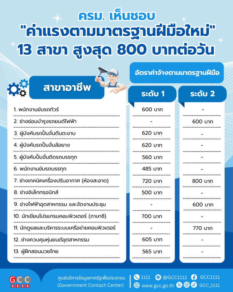 ครม. เห็นชอบ “ค่าแรงตามมาตรฐานฝีมือใหม่” 13 สาขา สูงสุด 800 บาทต่อวัน