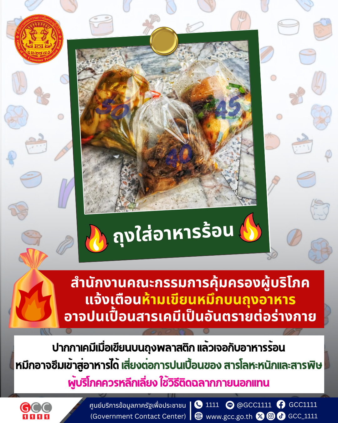 สำนักงานคณะกรรมการคุ้มครองผู้บริโภค แจ้งเตือนห้ามเขียนหมึกบนถุงอาหารอาจปนเปื้อนสารเคมีเป็นอันตรายต่อร่างกาย โดยปากกาเคมีเมื่อเขียนบนถุงพลาสติก แล้วเจอกับอาหารร้อน หมึกอาจซึมเข้าสู่อาหารได้ เสี่ยงต่อการปนเปื้อนของ สารโลหะหนักและสารพิษ ทั้งนี้ ผู้บริโภคควรหลีกเลี่ยง ใช้วิธีติดฉลากภายนอกแทน