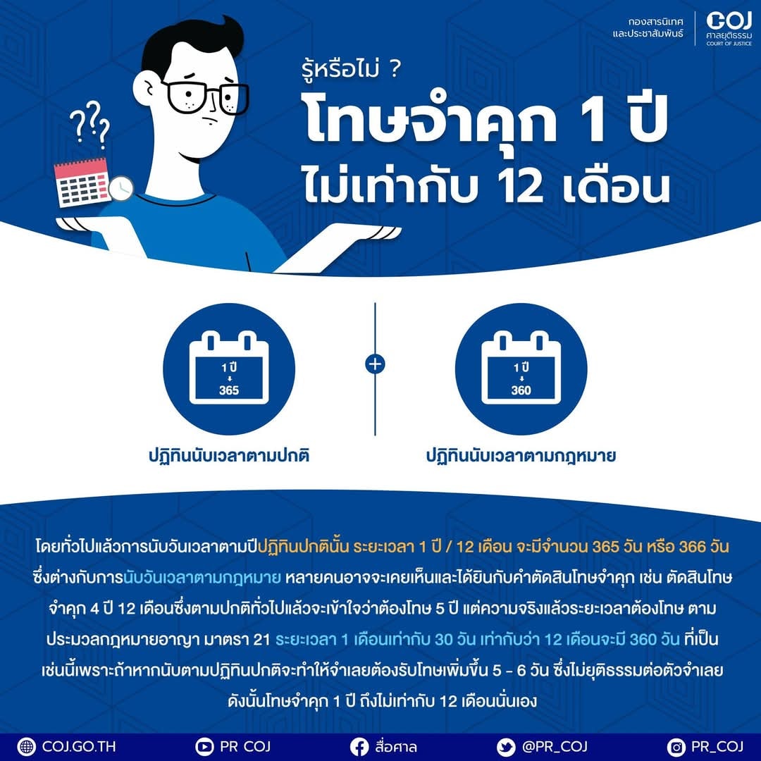 สำนักงานศาลยุติธรรม แนะนำโทษจำคุก 1 ปี ไม่เท่ากับ 12 เดือน โดยทั่วไปแล้วการนับวันเวลาตามปีปฏิทินปกตินั้น ระยะเวลา 1 ปี / 12 เดือน จะมีจำนวน 365 วัน หรือ 366 วัน ซึ่งต่างกับการนับวันเวลาตามกฎหมาย หลายคนอาจจะเคยเห็นและได้ยินกับคำตัดสินโทษจำคุก เช่น ตัดสินโทษ จําคุก 4 ปี 12 เดือน ซึ่งตามปกติทั่วไปแล้วจะเข้าใจว่าต้องโทษ 5 ปี แต่ความจริงแล้วระยะเวลาต้องโทษ ตาม ประมวลกฎหมายอาญา มาตรา 21 ระยะเวลา 1 เดือนเท่ากับ 30 วัน เท่ากับว่า 12 เดือนจะมี 360 วัน ที่เป็นเช่นนี้เพราะถ้าหากนับตามปฏิทินปกติจะทำให้จำเลยต้องรับโทษเพิ่มขึ้น 5 – 6 วัน ซึ่งไม่ยุติธรรมต่อตัวจำเลย ดังนั้นโทษจำคุก 1 ปี ถึงไม่เท่ากับ 12 เดือนนั่นเอง