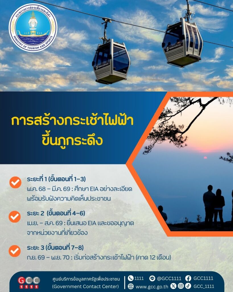 กระทรวงการท่องเที่ยวและกีฬา ประกาศไทม์ไลน์ 8 ขั้นตอน โครงการกระเช้าไฟฟ้าภูกระดึง โดยการก่อสร้างมีขั้นตอนหลักด้วยกัน 8 ขั้นตอน ใช้ระยะเวลาดำเนินการ 2 ปี 6 เดือนโดยประมาณ นับจากเดือน พ.ค. 2568 – พ.ย. 2570