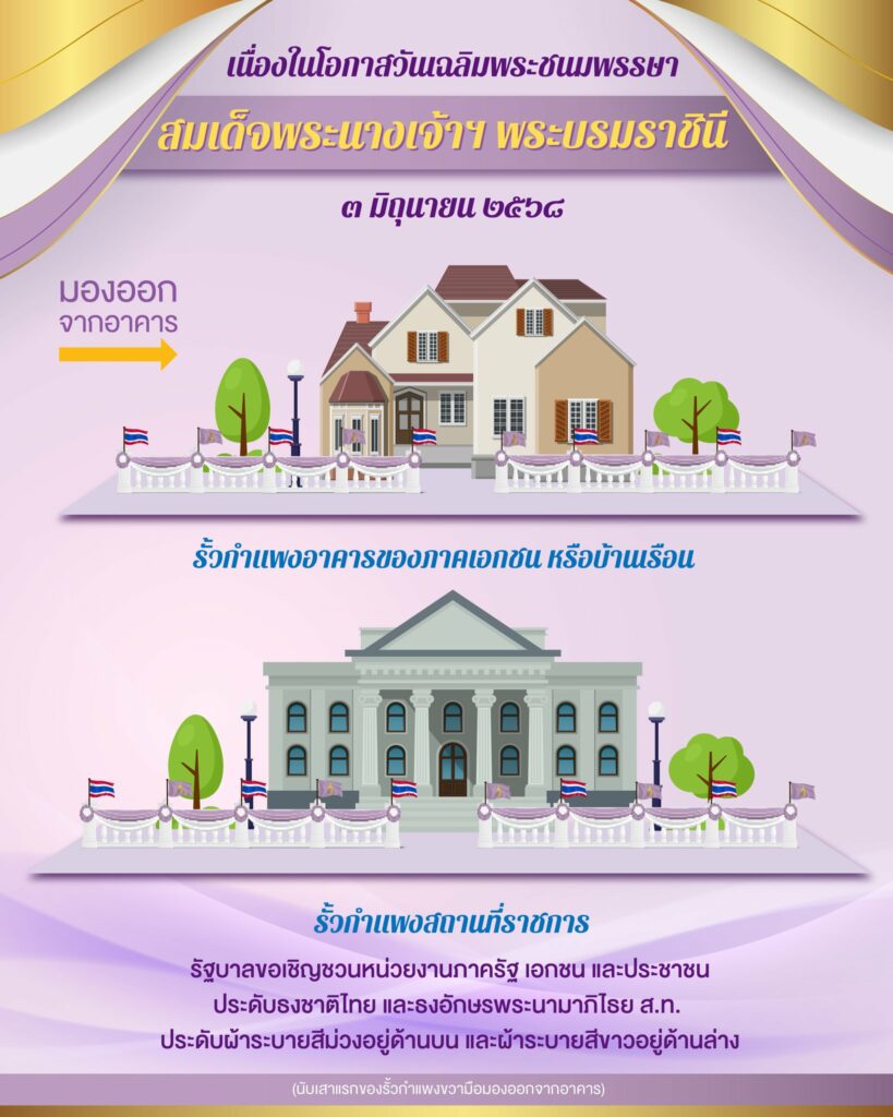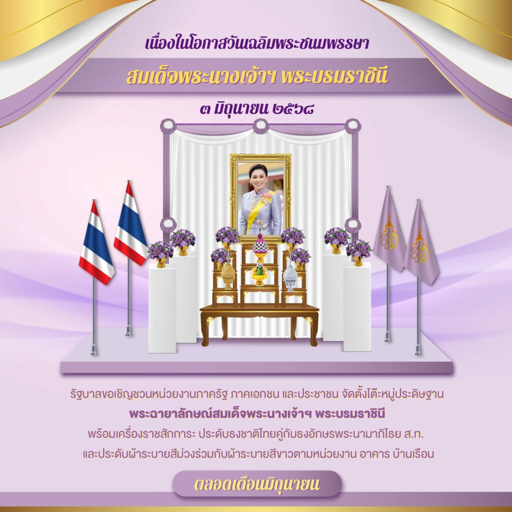 รัฐบาล ขอเชิญชวนหน่วยงานภาครัฐ ภาคเอกชน และประชาชนทั่วประเทศ ร่วมแสดงความจงรักภักดีและเทิดทูนสถาบันพระมหากษัตริย์ เนื่องในโอกาสวันเฉลิมพระชนมพรรษา สมเด็จพระนางเจ้าฯ พระบรมราชินี วันที่ 3 มิถุนายน 2568 โดยการจัดตั้งโต๊ะหมู่ประดิษฐานพระฉายาลักษณ์สมเด็จพระนางเจ้าฯ พระบรมราชินี พร้อมเครื่องราชสักการะ ณ ที่ตั้งหน่วยงาน อาคาร และบ้านเรือน และขอให้ประดับธงชาติไทย คู่กับ ธงพระนามาภิไธย ส.ท. ตกแต่งสถานที่ด้วยผ้าระบายสีม่วงร่วมกับสีขาวอย่างเหมาะสม ตลอดช่วงเดือนมิถุนายน 2568