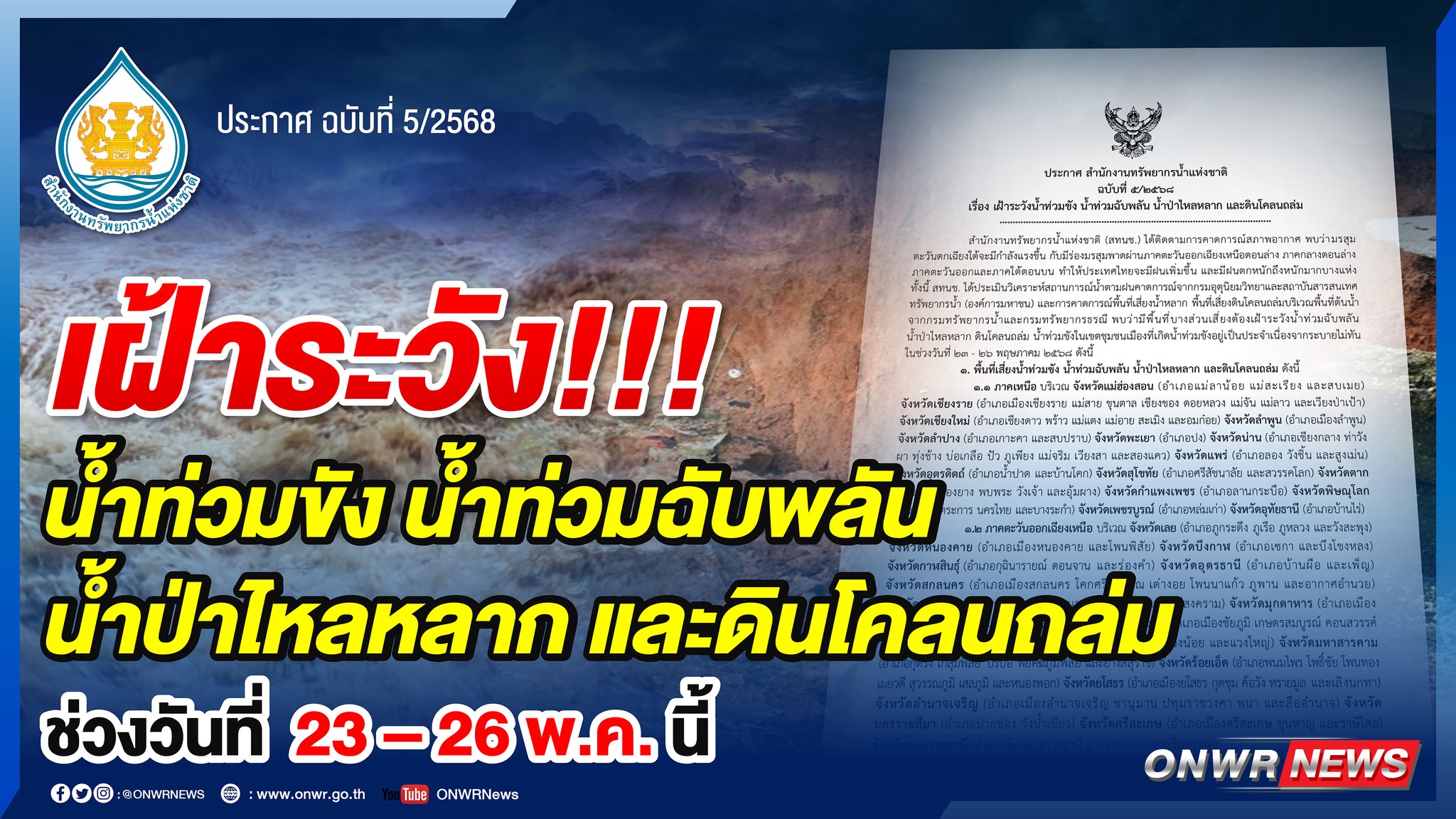 สำนักงานทรัพยากรน้ำแห่งชาติ แจ้งเตือน เฝ้าระวังน้ำท่วมขัง น้ำท่วมฉับพลัน น้ำป่าไหลหลาก และดินโคลนถล่ม ในช่วงวันที่ 23 – 26 พฤษภาคม 2568