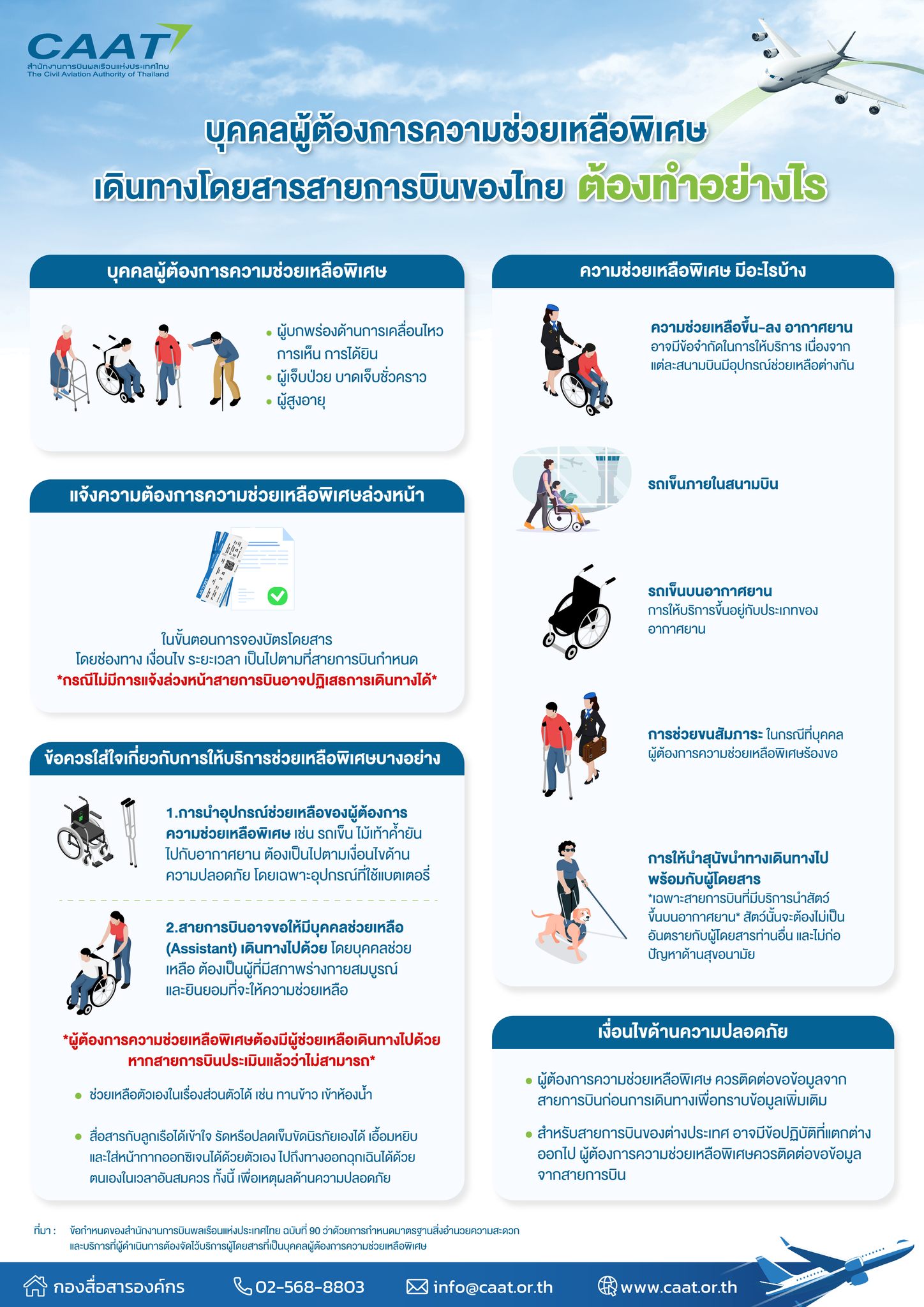ทั้งนี้ อาจมีเงื่อนไขด้านความปลอดภัยอื่นๆ ขึ้นอยู่กับลักษณะของผู้โดยสารซึ่งเป็นบุคคลผู้ต้องการความช่วยเหลือพิเศษแต่ละท่าน ดังนั้น CAAT จึงขอแนะนำให้ผู้โดยสารสอบถามข้อมูลจากสายการบินเพิ่มเติม เพื่อให้การเดินทางเป็นไปโดยสะดวกและปลอดภัย