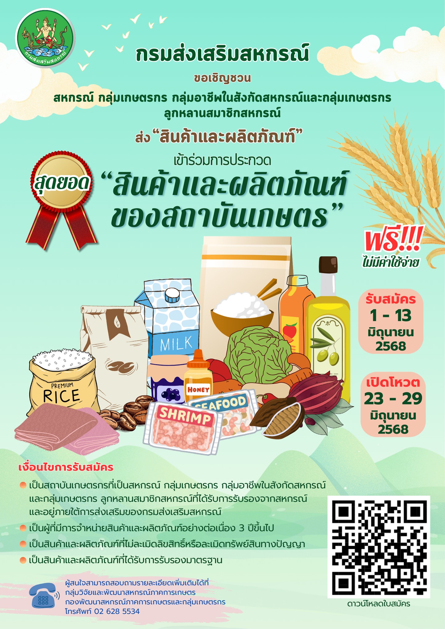 กรมส่งเสริมสหกรณ์ เชิญชวน สหกรณ์ กลุ่มเกษตรกร กลุ่มอาชีพในสังกัดสหกรณ์และกลุ่มเกษตรกร ลูกหลานสมาชิกสหกรณ์ ส่งสินค้าและผลิตภัณฑ์ เข้าร่วมประกวด “สุดยอดสินค้าและผลิตภัณฑ์ของสถาบันเกษตร” เปิดรับสมัครวันที่ 1 – 13 มิถุนายน 2568 สมัครฟรีไม่มีค่าใช้จ่าย สามารดาวน์โหลดใบสมัครได้ที่ คลิกที่นี่