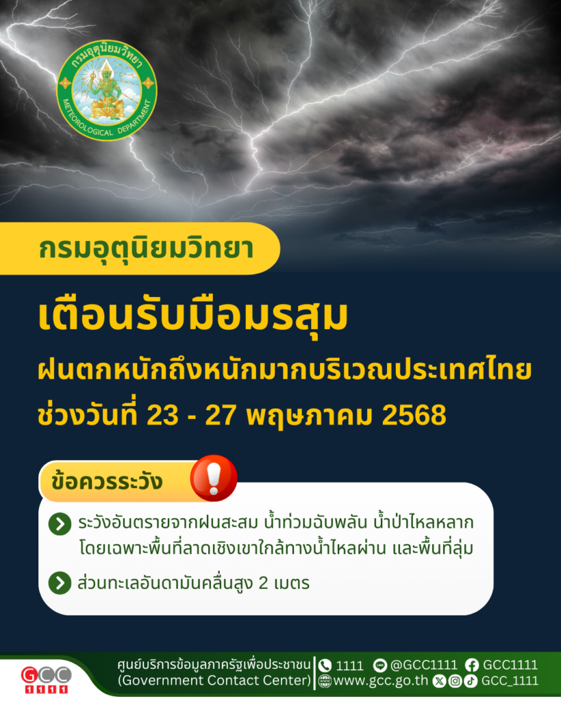กรมอุตุนิยมวิทยา เตือนรับมือมรสุม ฝนตกหนักถึงหนักมาก วันที่ 23 – 27 พฤษภาคม 2568