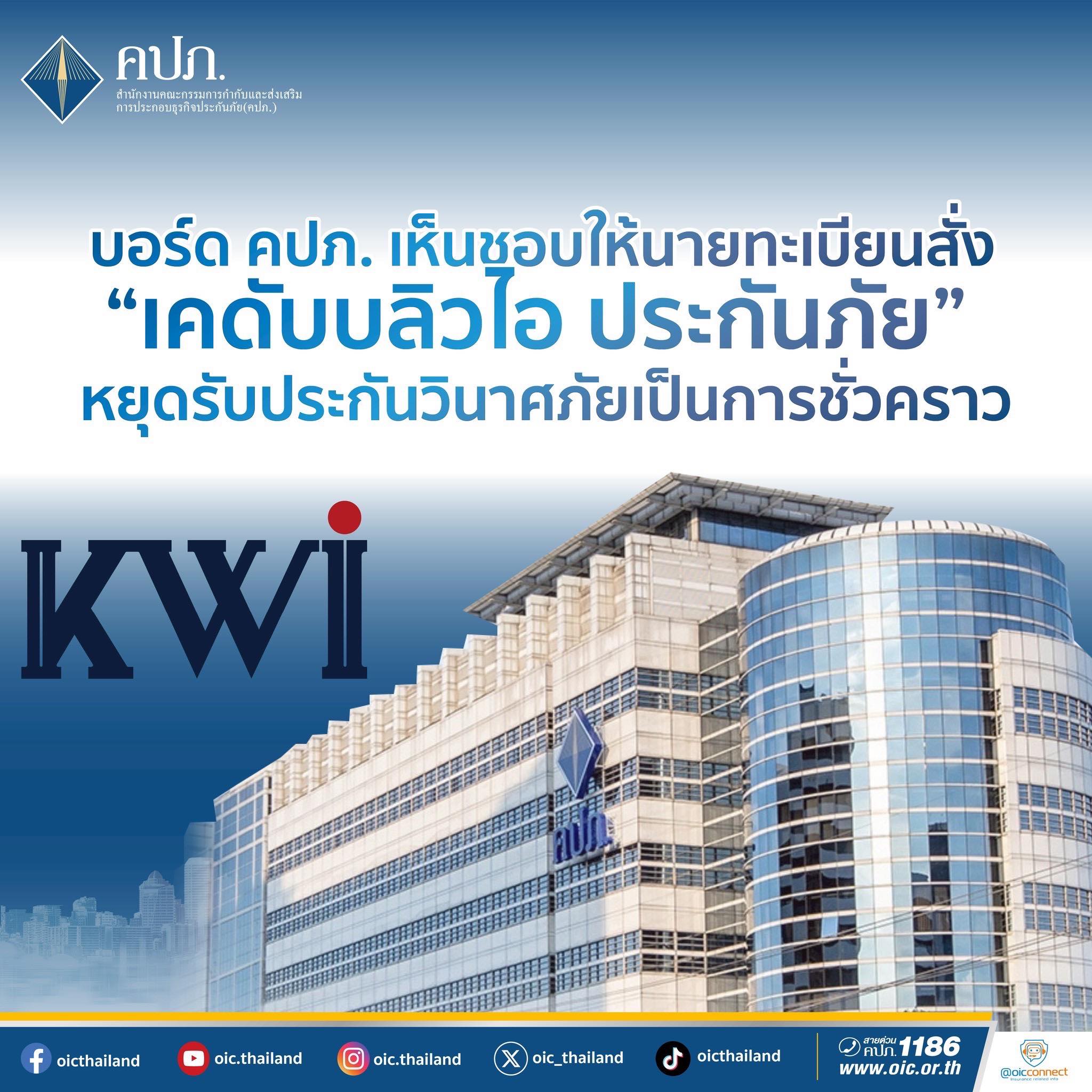 บอร์ด คปภ. มีมติเห็นชอบให้บริษัท เคดับบลิวไอ ประกันภัย จำกัด (มหาชน) หยุดรับประกันวินาศภัยเป็นการชั่วคราว ตั้งแต่วันที่ 22 พฤษภาคม 2568 เป็นต้นไป