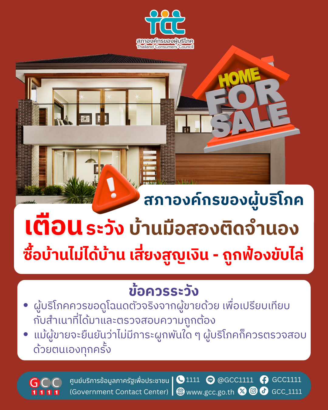 สภาองค์กรของผู้บริโภค เตือน ระวัง บ้านมือสองติดจำนอง ซื้อบ้านไม่ได้บ้าน เสี่ยงสูญเงิน – ถูกฟ้องขับไล่ โดยมีผู้บริโภคถูกหลอกขาย บ้านมือสอง ติดจำนอง ซึ่งเป็นบ้านประมูลของกรมบังคับคดี ผ่านสื่อสังคมออนไลน์ โดยมีเงื่อนไขการซื้อขายที่ดึงดูดความสนใจ เช่น ดาวน์ต่ำ ดอกเบี้ยถูก และใช้บัตรประชาชนเพียงใบเดียวก็สามารถซื้อบ้านได้ และไม่มีการตรวจสอบประวัติทางการเงินใดๆ ทำให้ผู้หลงเชื่อจำนวนมาก มีผู้เสียหายกว่า 100 ราย มูลค่าความเสียหายกว่า 300 ล้านบาท ทั้งนี้ ซื้อบ้านมือสองอย่าลืมตรวจสอบ ก่อนตัดสินใจซื้อควรตรวจสอบว่าบ้านหลังดังกล่าวเป็นบ้านติดจำนองหรือไม่ สิ่งที่ควรทำก่อนตัดสินซื้อบ้านมือสอง คือ การขอสำเนาโฉนดที่ดินจากผู้ขายเพื่อนำมาตรวจสอบข้อมูลเบื้องต้น