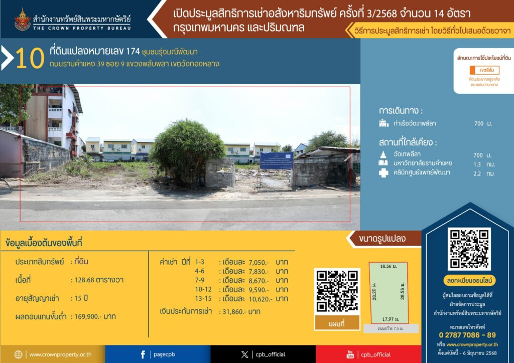 สำนักงานทรัพย์สินพระมหากษัตริย์ เปิดประมูลสิทธิการเช่า 15 ปี ที่ดินหมายเลข 174 บัดนี้ – 6 มิ.ย. 68