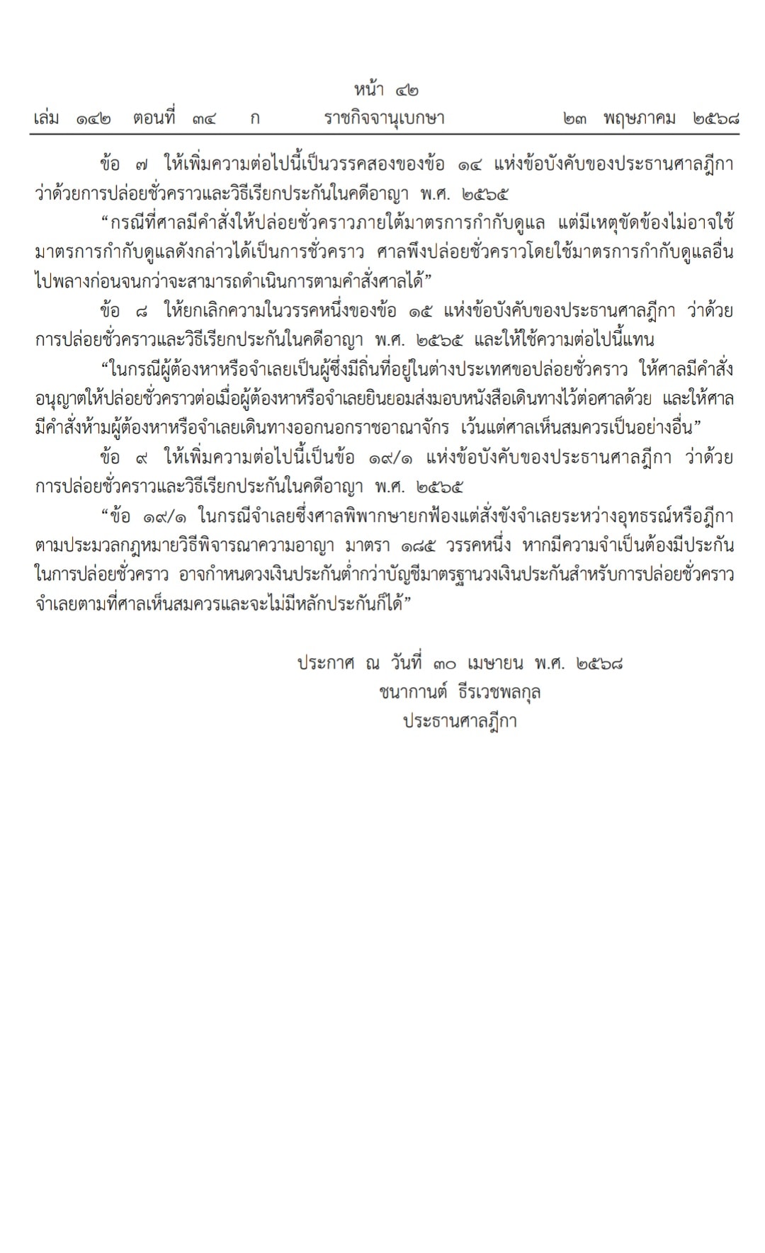 ราชกิจจานุเบกษา ประกาศข้อบังคับของประธานศาลฎีกา ว่าด้วยการปล่อยชั่วคราวและวิธีเรียกประกันในคดีอาญา (ฉบับที่ 2) พ.ศ. 2568
