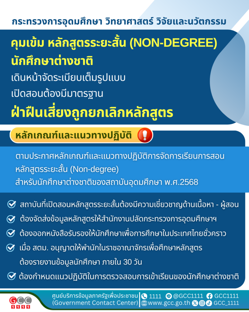 กระทรวงการอุดมศึกษา วิทยาศาสตร์ วิจัยและนวัตกรรม คุมเข้ม “หลักสูตรระยะสั้น (Non-degree) นักศึกษาต่างชาติ”