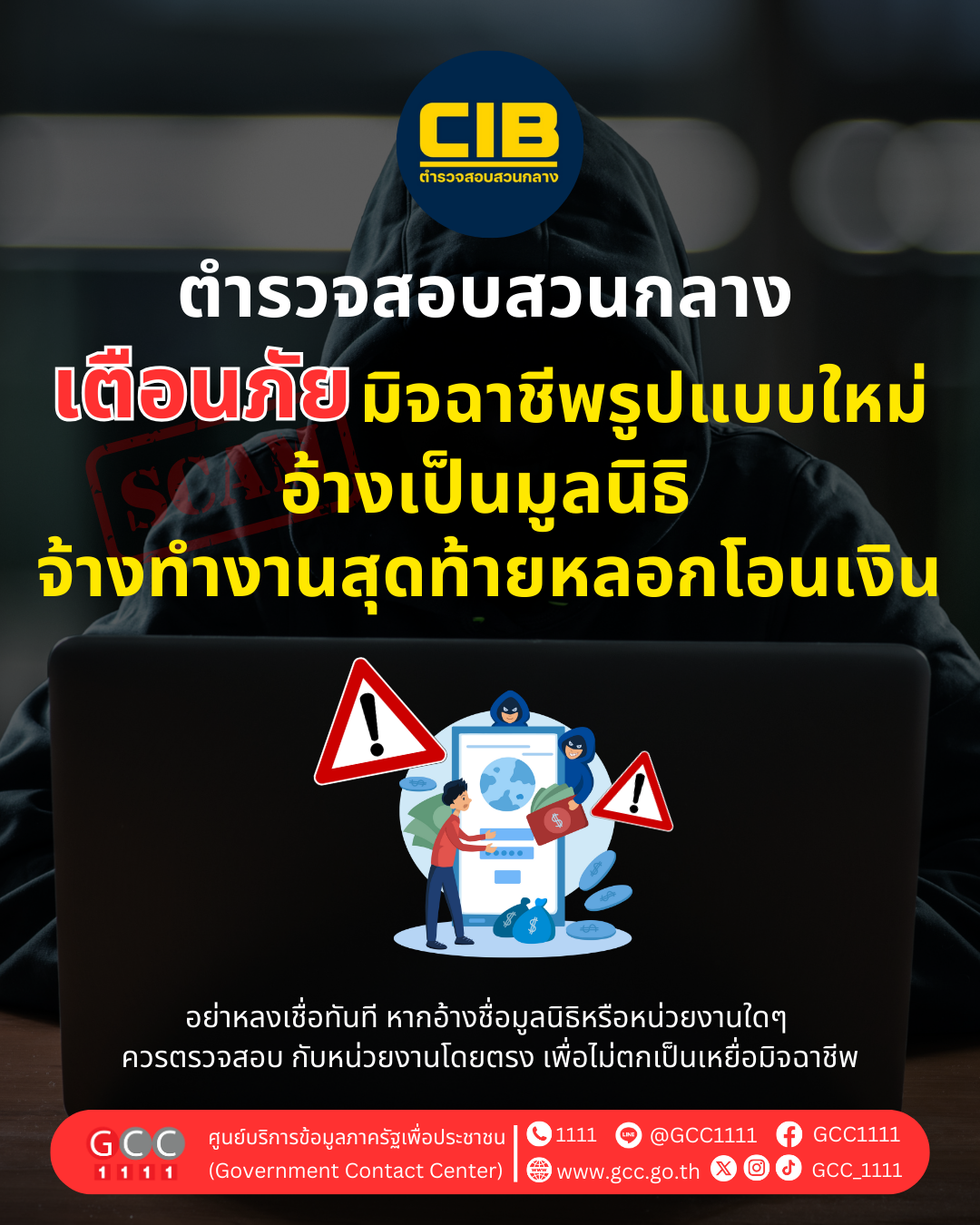ตำรวจสอบสวนกลาง เตือนภัย มิจฉาชีพรูปแบบใหม่ อ้างเป็นมูลนิธิ จ้างทำงานสุดท้ายหลอกโอนเงิน