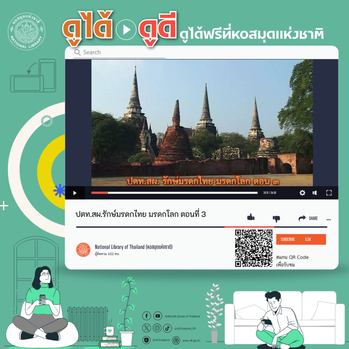 หอสมุดแห่งชาติ นำเสนอรายการ “ดูได้ ดูดีดูได้ฟรีที่หอสมุดแห่งชาติ” โดยนำวีดิทัศน์ต่างๆ ที่หอสมุด รวมถึงกรมศิลปากร ได้จัดทำหรือเผยแพร่ มาให้รับชมใหม่เป็นประจำทุกวันอาทิตย์ จึงขอนำเสนอวีดิทัศน์ ตอน “ปตท.สผ.รักษ์มรดกไทย มรดกโลก ตอนที่ 3” สามารถรับชมได้ที่ คลิก