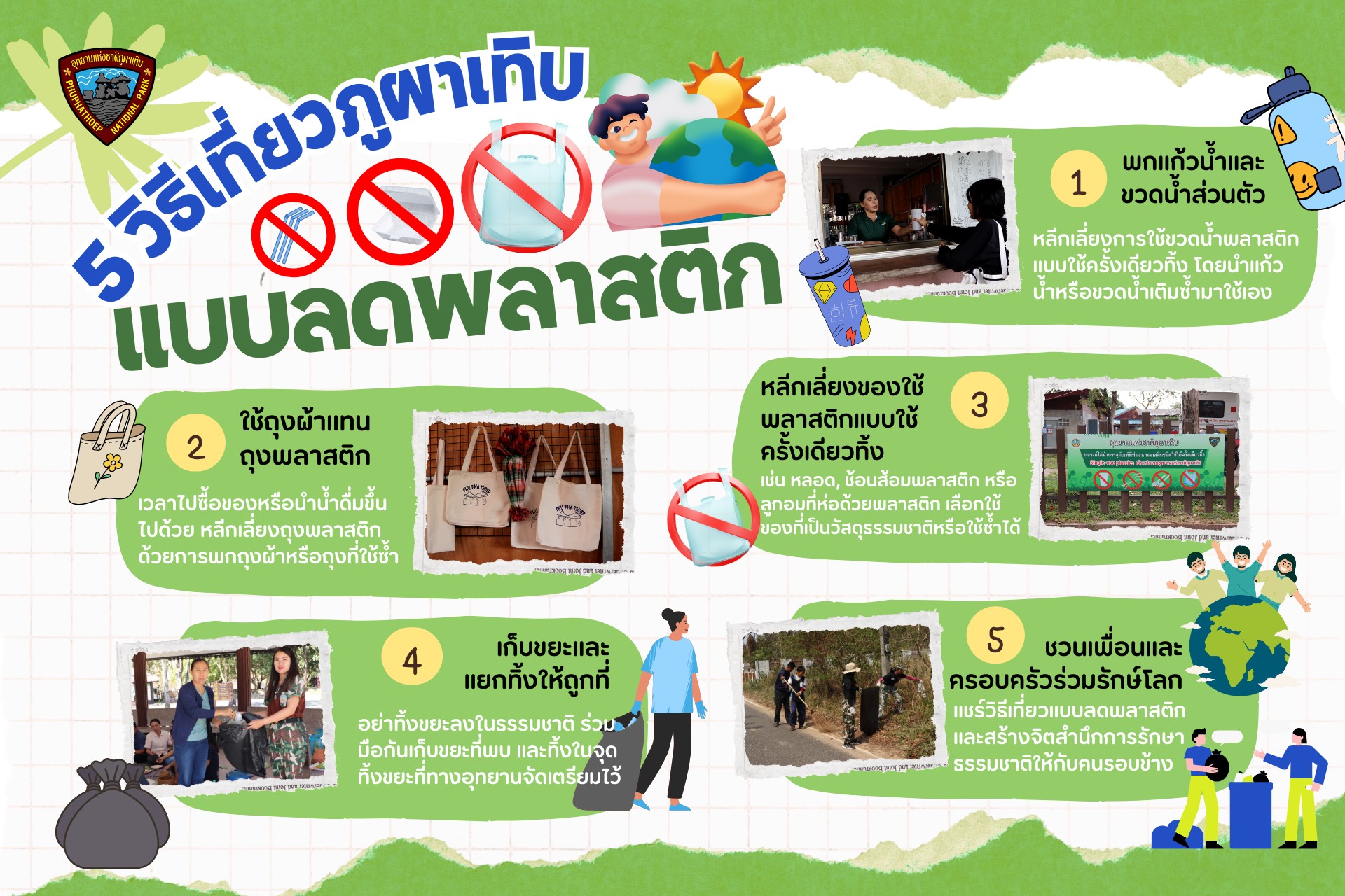 อุทยานแห่งชาติภูผาเทิบ เชิญชวนนักท่องเที่ยว เที่ยวภูผาเทิบ รักษ์โลก ลดพลาสติกใช้ครั้งเดียว ด้วย 5 วิธีเที่ยวภูผาเทิบแบบลดพลาสติก ดังนี้