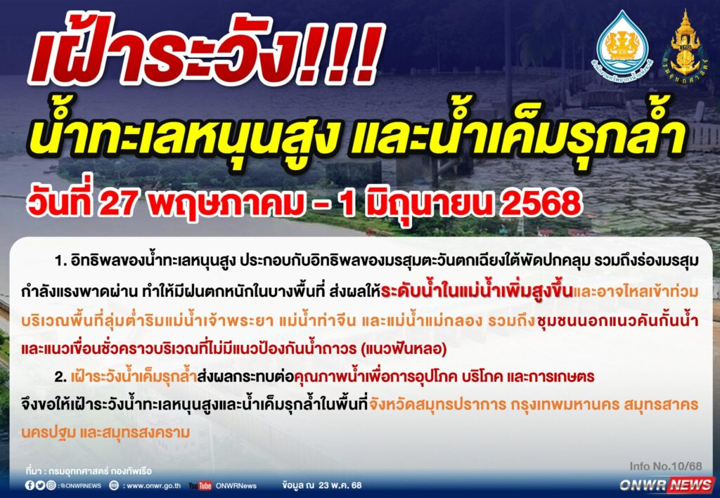 สำนักงานทรัพยากรน้ำแห่งชาติ ประกาศเฝ้าระวัง น้ำทะเลหนุนสูง และน้ำเค็มรุกล้ำ วันที่ 27 พฤษภาคม – 1 มิถุนายน 2568