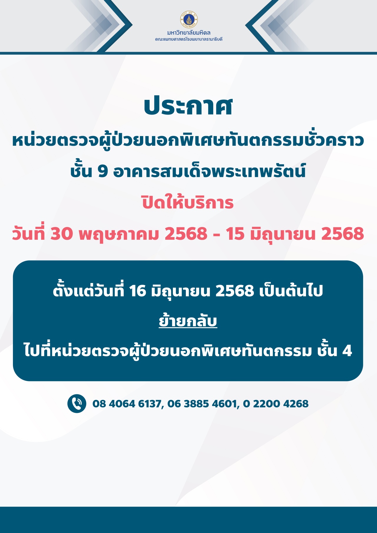 คณะแพทยศาสตร์โรงพยาบาลรามาธิบดี ประกาศปิดให้บริการหน่วยตรวจผู้ป่วยนอกพิเศษทันตกรรมชั่วคราว วันที่ 30 พฤษภาคม – 15 มิถุนายน 2568 ณ ชั้น 9 อาคารสมเด็จพระเทพรัตน์ และตั้งแต่วันที่ 16 มิถุนายน 2568 เป็นต้นไป ย้ายกลับ ไปที่หน่วยตรวจผู้ป่วยนอกพิเศษทันตกรรม ชั้น 4