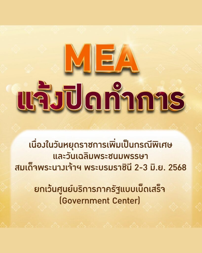 - โดยที่ทำการ MEA อื่น ๆ จะเปิดทำการและให้บริการตามปกติ ในวันพุธที่ 4 มิถุนายน 2568 ระหว่างเวลา 07.30 – 15.30 น.