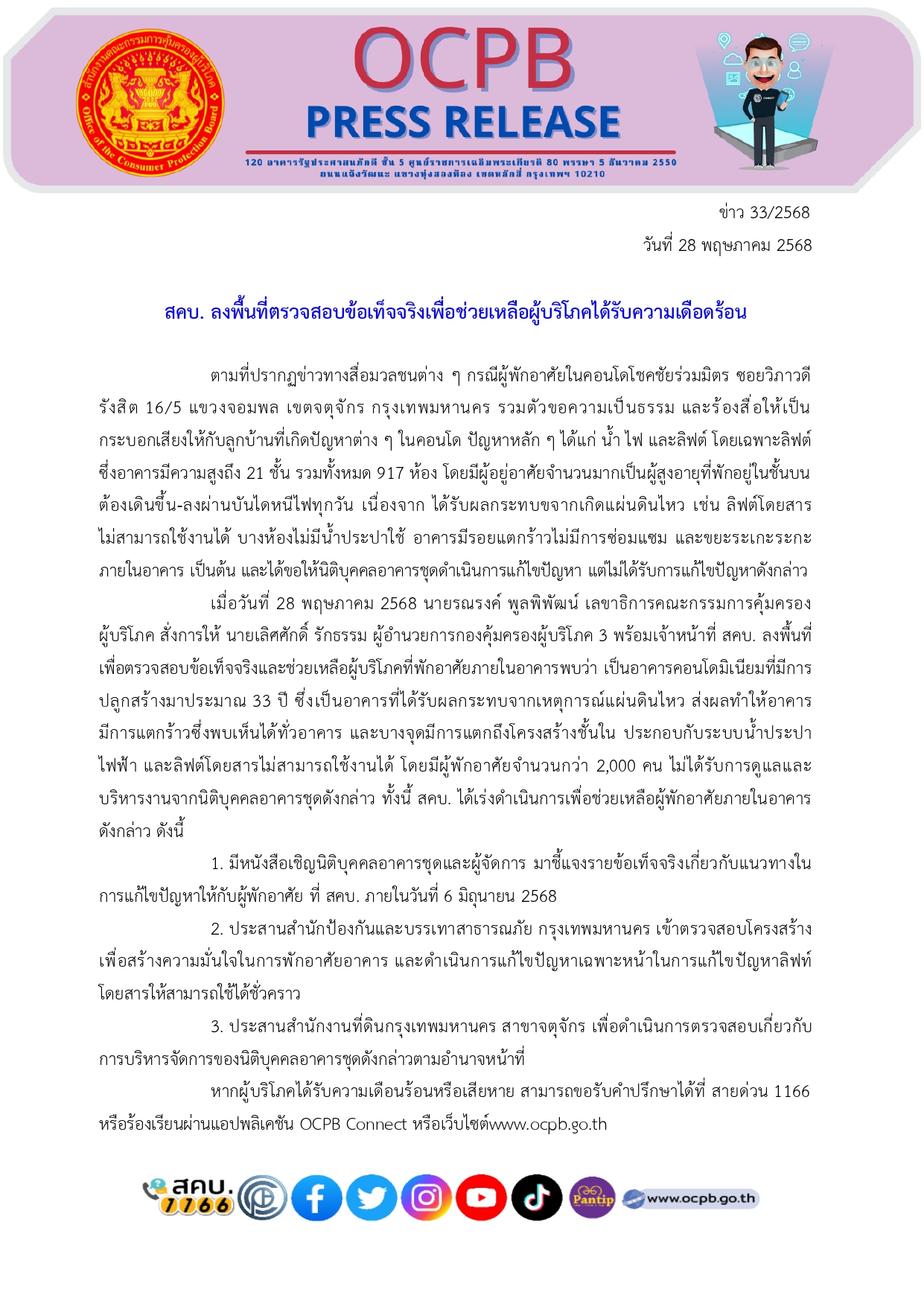 เมื่อวันที่ 28 พฤษภาคม 2568 นายรณรงค์ พูลพิพัฒน์ เลขาธิการคณะกรรมการคุ้มครองผู้บริโภค สั่งการให้ นายเลิศศักดิ์ รักธรรม ผู้อำนวยการกองคุ้มครองผู้บริโภค 3 พร้อมเจ้าหน้าที่ สคบ. ลงพื้นที่เพื่อตรวจสอบข้อเท็จจริงและช่วยเหลือผู้บริโภคที่พักอาศัยภายในอาคารพบว่า เป็นอาคารคอนโดมิเนียมที่มีการปลูกสร้างมาประมาณ 33 ปี ซึ่งเป็นอาคารที่ได้รับผลกระทบจากเหตุการณ์แผ่นดินไหว ส่งผลทำให้อาคารมีการแตกร้าวซึ่งพบเห็นได้ทั่วอาคาร และบางจุดมีการแตกถึงโครงสร้างชั้นใน ประกอบกับระบบน้ำประปา ไฟฟ้า และลิฟต์โดยสารไม่สามารถใช้งานได้ โดยมีผู้พักอาศัยจำนวนกว่า 2,000 คน ไม่ได้รับการดูแลและบริหารงานจากนิติบุคคลอาคารชุดดังกล่าว ทั้งนี้ สคบ. ได้เร่งดำเนินการเพื่อช่วยเหลือผู้พักอาศัยภายในอาคารดังกล่าว ดังนี้