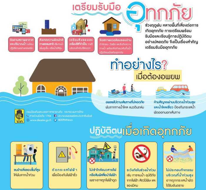 กระทรวงมหาดไทย โดยกรมป้องกันและบรรเทาสาธารณภัย (ปภ.) แนะเตรียมพร้อมรับมือในช่วงฤดูฝน เฝ้าระวังติดตามพยากรณ์อากาศ ประกาศแจ้งเตือน พร้อมปฎิบัติตามคำแนะนำ หากมีฝนตกต่อเนื่องให้สังเกตระดับน้ำ ถ้าสูงขึ้นผิดปกติ ให้เตรียมขนย้ายสิ่งของ-เครื่องใช้ไฟฟ้าขึ้นที่สูง ทำกระสอบทรายเสริมคั้นกั้นน้ำ และเตรียมสิ่งของที่จำเป็น ทั้งเครื่องอุปโภคบริโภค ยารักษาโรค รวมทั้งระมัดระวังการใช้ไฟภายในบ้านเพื่อป้องกันการถูกไฟดูด อีกทั้งสวมรองเท้าบูททุกครั้งเมื่อลุยน้ำท่วมเพื่อป้องกันอันตราย