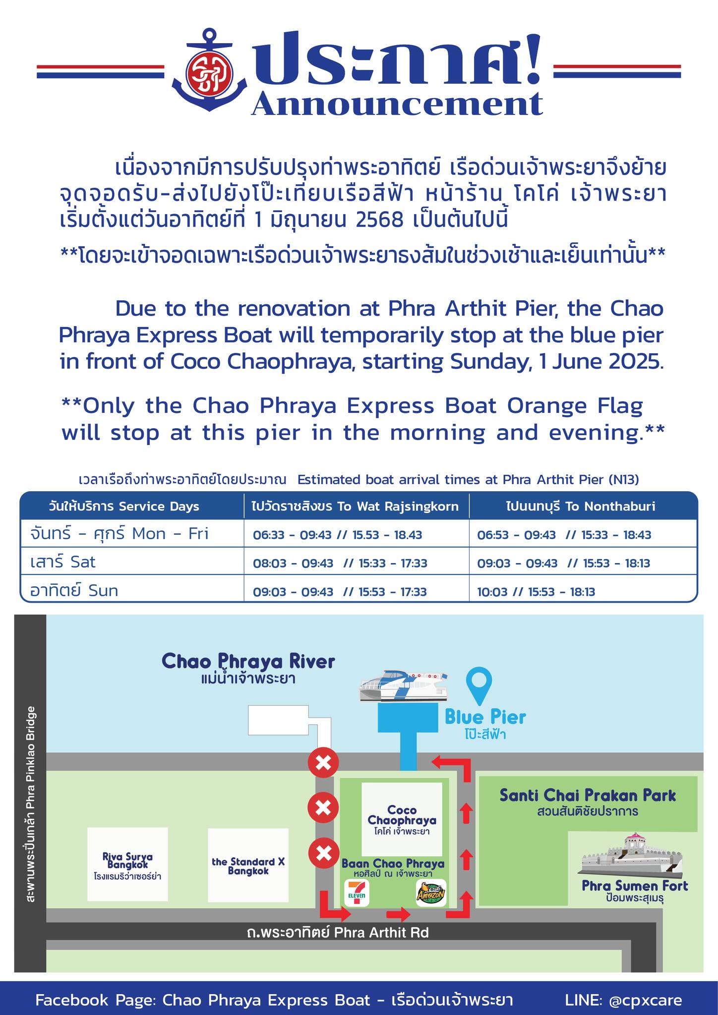 เรือด่วนเจ้าพระยา ประกาศย้ายจุดจอดรับ-ส่งไปยังโป๊ะเทียบเรือสีฟ้า หน้าร้าน Coco Chaophraya เนื่องจากมีการปรับปรุงท่าพระอาทิตย์ เริ่มตั้งแต่วันที่ 1 มิถุนายน 2568 เป็นต้นไป โดยจะเข้าจอดเฉพาะเรือด่วนเจ้าพระยาธงส้มในช่วงเช้าและเย็นเท่านั้น