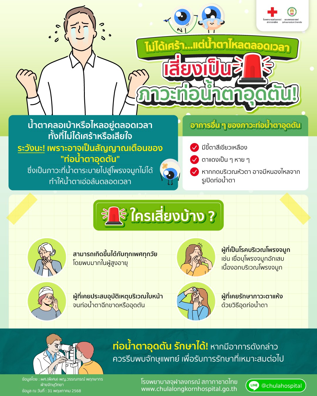 โรงพยาบาลจุฬาลงกรณ์ สภากาชาดไทย แนะนำไม่ได้เศร้า แต่น้ำตาไหลตลอดเวลา เสี่ยงเป็น ภาวะท่อน้ำตาอุดตัน