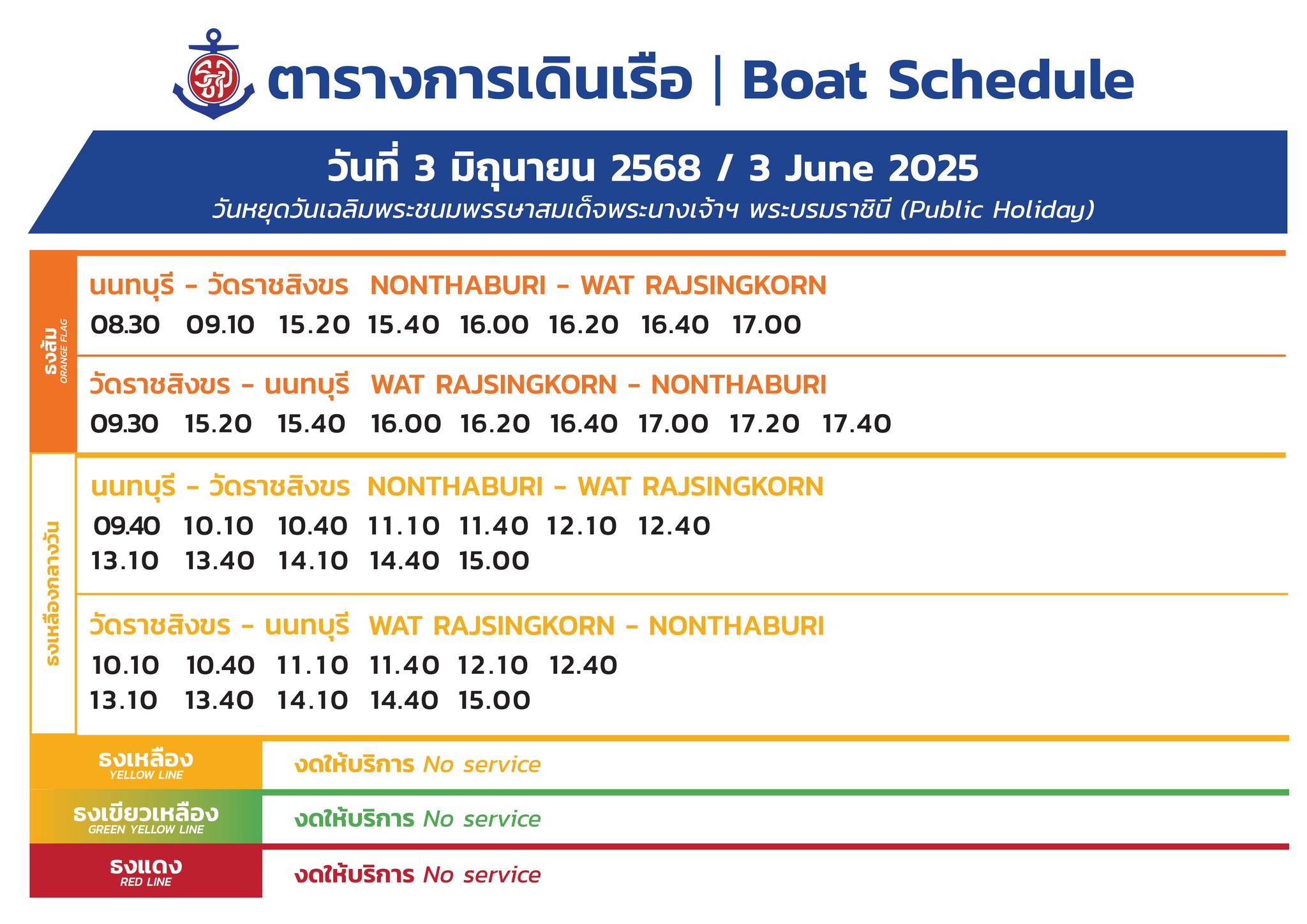 หมายเหตุ งดให้บริการเรือธงเหลือง (เช้า/เย็น) เรือธงเหลือง (กลางวัน) เรือธงเขียวเหลือง และเรือปรับอากาศธงแดง