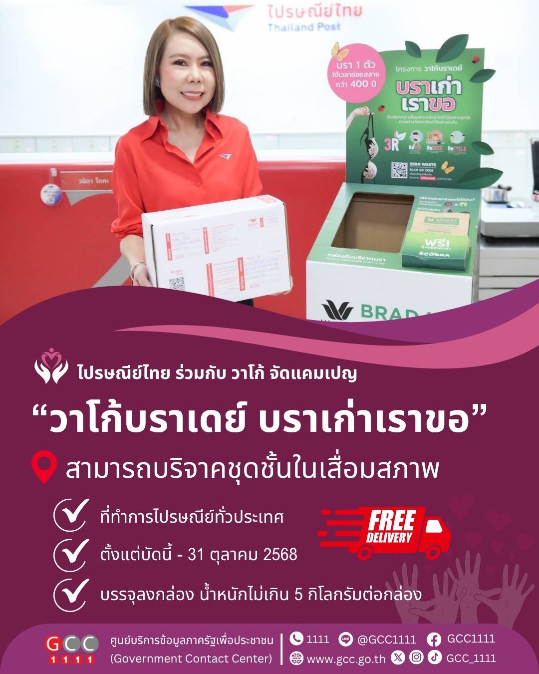 บริษัท ไปรษณีย์ไทย จำกัด ร่วมกับ บริษัท ไทยวาโก้ จำกัด (มหาชน) จัดแคมเปญ “วาโก้บราเดย์ บราเก่าเราขอ” ปีที่ 3 โดยเปิดรับบริจาคชุดชั้นในเสื่อมสภาพจากประชาชนผ่านที่ทำการไปรษณีย์ทั่วประเทศ ตั้งแต่บัดนี้ – 31 ตุลาคม 2568