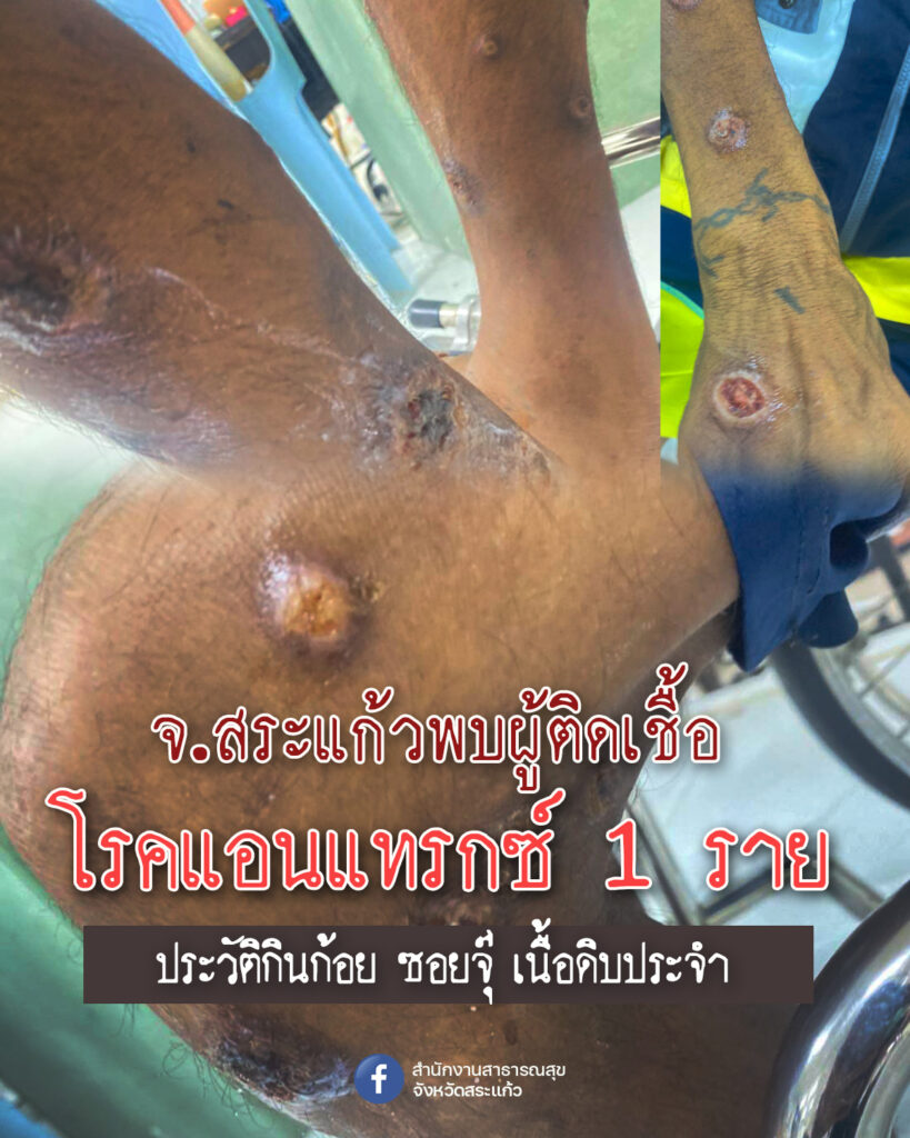 สำนักงานสาธารณสุขจังหวัดสระแก้ว รายงานพบผู้ป่วยโรคแอนแทรกซ์รายแรกของจังหวัด คาดว่าเชื้อมาจากการบริโภคเนื้อสัตว์ที่ไม่ผ่านการปรุงสุกอย่างปลอดภัย