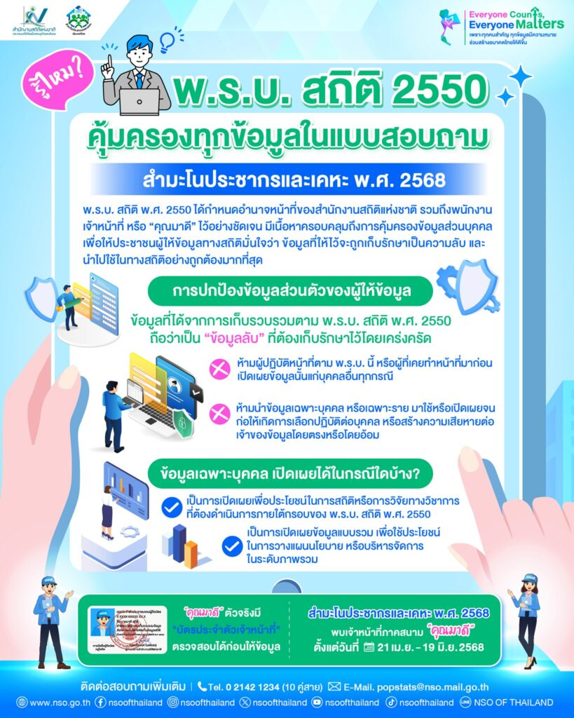 รู้ไหมว่า…ทุกข้อมูลในแบบสอบถามสำมะโนประชากรและเคหะ พ.ศ. 2568 ได้รับการคุ้มครองตามกฎหมาย ด้วย พ.ร.บ. สถิติ พ.ศ. 2550