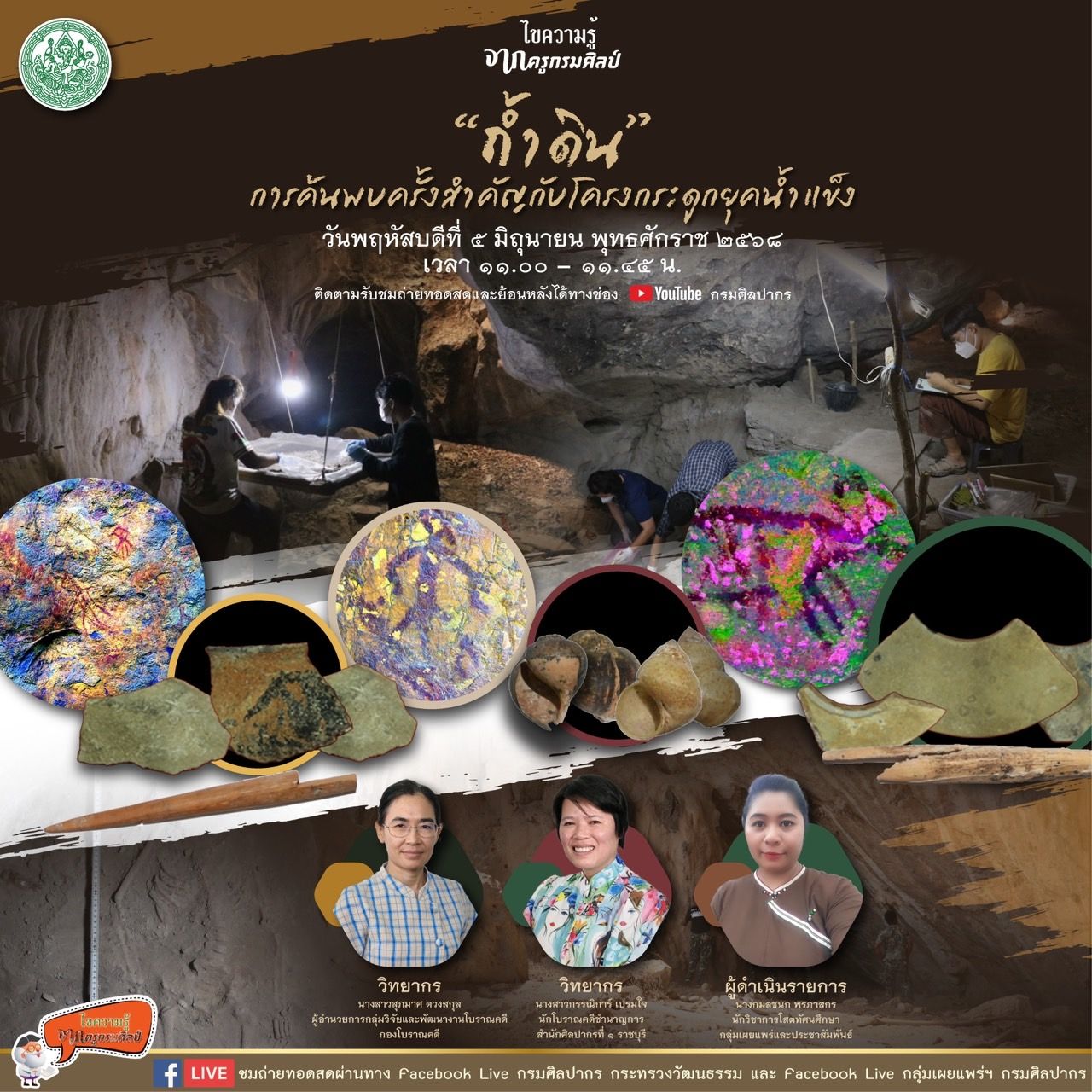 กรมศิลปากร ขอเชิญรับชมถ่ายทอด Facebook Live รายการไขความรู้จากครูกรมศิลป์ “ถ้ำดิน” การค้นพบครั้งสำคัญกับโครงกระดูกยุคน้ำแข็ง วิทยากร นางสาวสุภมาศ ดวงสกุล ผู้อำนวยการกลุ่มวิจัยและพัฒนางานโบราณคดี กองโบราณคดี และนางสาวกรรณิการ์ เปรมใจ นักโบราณคดีชำนาญการ สำนักศิลปากรที่ 1 ราชบุรี ผู้ดำเนินรายการ นางกมลชนก พรภาสกร นักวิชาการโสตทัศนศึกษา กลุ่มเผยแพร่และประชาสัมพันธ์ ในวันพฤหัสบดีที่ 5 มิถุนายน พุทธศักราช 2568 เวลา 11.00 – 11.45 น. ผู้สนใจสามารถติดตามชมได้ทาง Facebook Live : กรมศิลปากร กระทรวงวัฒนธรรม และ Facebook Live : กลุ่มเผยแพร่ฯ กรมศิลปากร