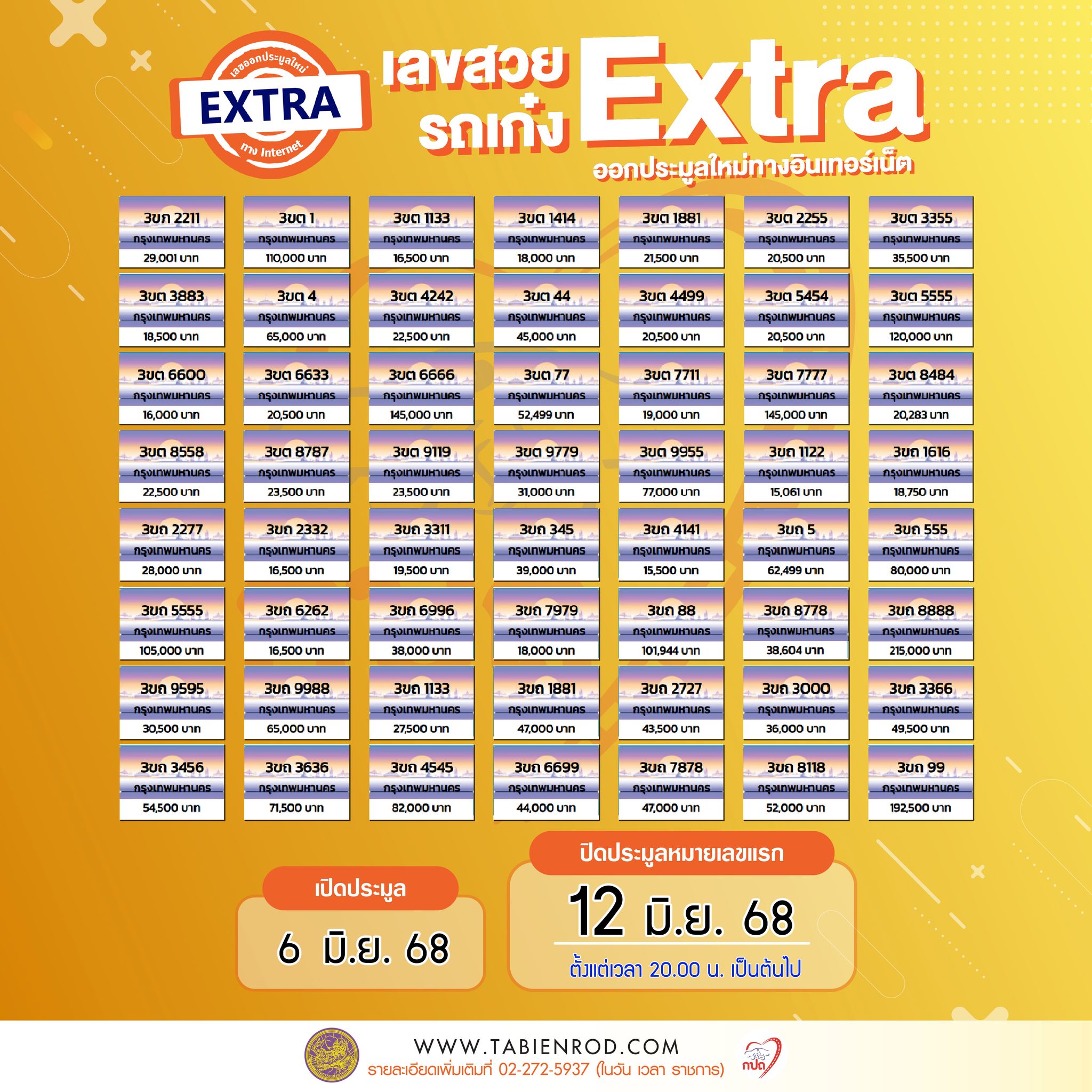 กองทุนเพื่อความปลอดภัยในการใช้รถใช้ถนน เปิดประมูลเลขสวยรถเก๋ง Extra ผ่านทางระบบอินเทอร์เน็ต  เปิดประมูลวันที่ 6 – 12 มิถุนายน 2568 ปิดประมูล 12 มิ.ย. 68 เวลา 20.00 น.เป็นต้นไป ประมูลผ่านทางระบบอินเทอร์เน็ต www.tabienrod.com