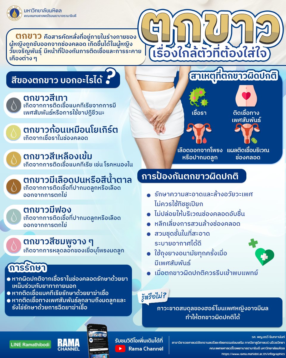 คณะแพทยศาสตร์โรงพยาบาลรามาธิบดี แจ้งเตือนตกขาวมีกลิ่น สีเปลี่ยน หรือคัน อาจบ่งบอกถึงการติดเชื้อ โดยตกขาว คือสารคัดหลั่งที่อยู่ภายในร่างกายของ ผู้หญิงถูกขับออกจากช่องคลอด เกิดขึ้นได้ในผู้หญิง วัยเจริญพันธุ์ มีหน้าที่ป้องกันการติดเชื้อและการระคาย เคืองต่าง ๆ