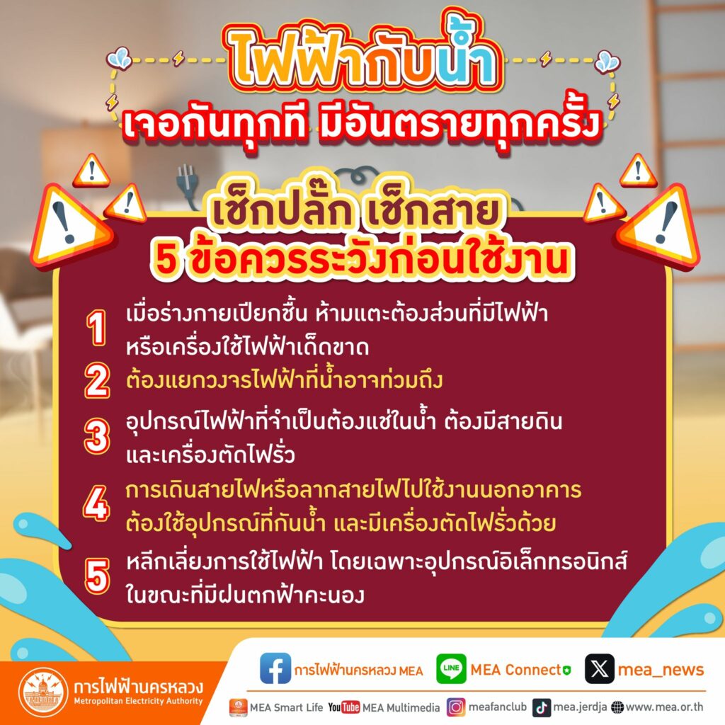 การไฟฟ้านครหลวง เตือนหลีกเลี่ยงการใช้เครื่องใช้ไฟฟ้าใกล้น้ำ พร้อมแนะนำ 5 ข้อ ควรระวัง