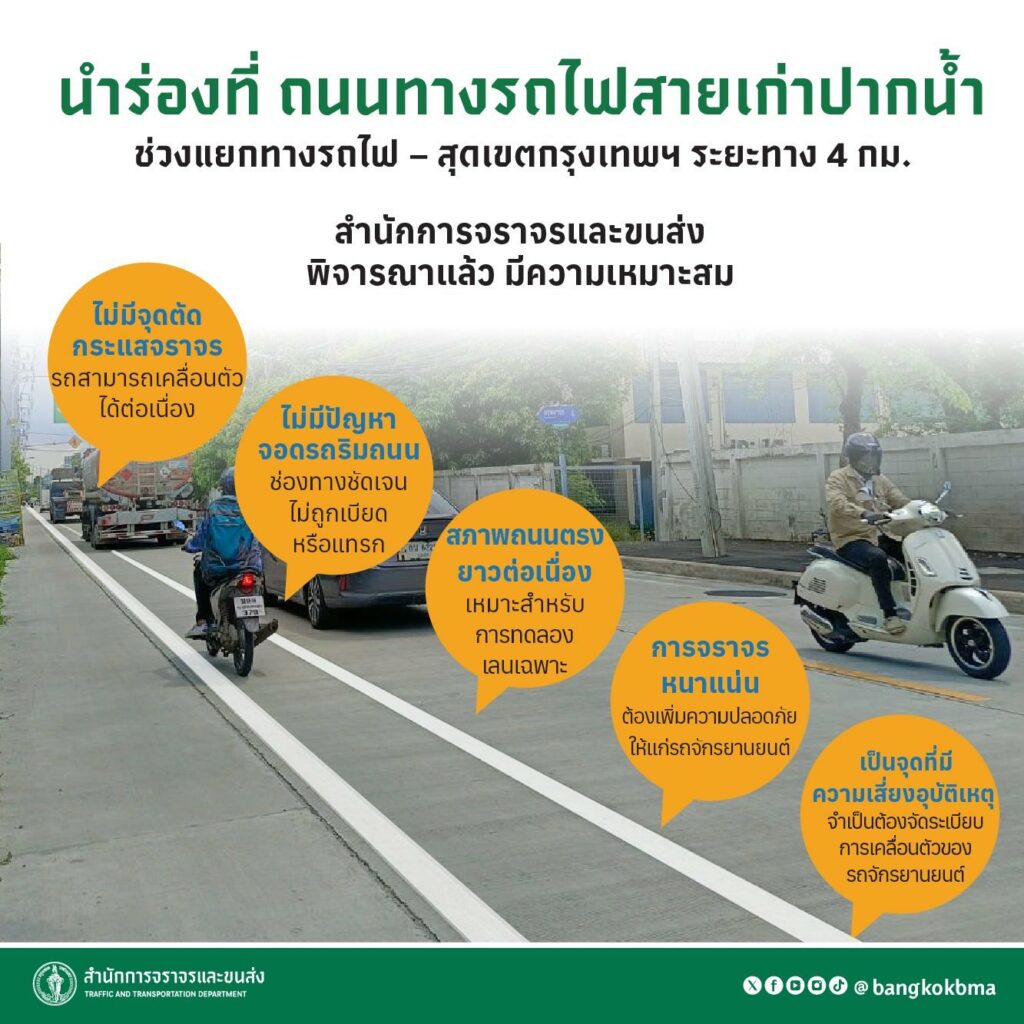 สำนักการจราจรและขนส่ง กรุงเทพมหานคร ได้ดำเนินโครงการนำร่อง “ช่องทางรถจักรยานยนต์ (MC LANE)” บริเวณเส้นทางสายเก่าปากน้ำ ช่วงแยกทางรถไฟ – สุดเขตกรุงเทพฯ ระยะทางประมาณ 4 กิโลเมตร ช่องทางนี้ถูกออกแบบเฉพาะสำหรับรถจักรยานยนต์ โดยมีวัตถุประสงค์เพื่อลดการปะปนกับยานพาหนะประเภทอื่น ช่วยเพิ่มความปลอดภัยในการเดินทาง ลดความแออัด และส่งเสริมการใช้ถนนอย่างมีระเบียบ