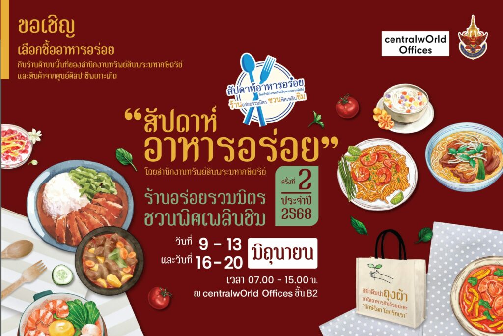 สำนักงานทรัพย์สินพระมหากษัตริย์ ร่วมกับ centralwOrld Offices ขอเชิญเลือกซื้ออาหารอร่อยหลากหลายนานาชนิดกับร้านค้าบนพื้นที่ของสำนักงานทรัพย์สินฯ และสินค้าจากศูนย์ศิลปาชีพเกาะเกิด ในงาน “สัปดาห์อาหารอร่อย” ครั้งที่ 2 ประจำปี 2568
