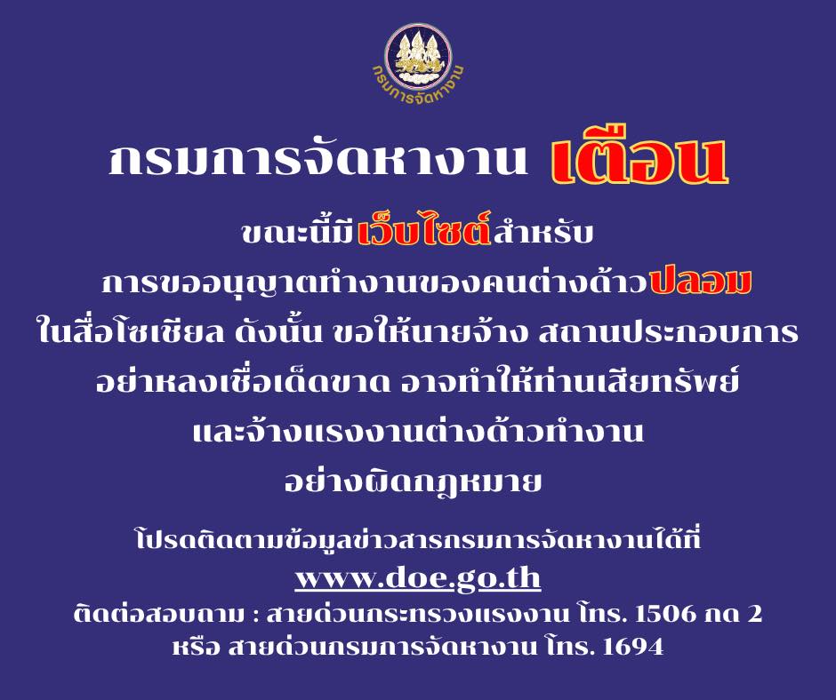 กรมการจัดหางาน เตือนขณะนี้มีเว็บไซต์สำหรับการขออนุญาตทำงานของคนต่างด้าวปลอมในสื่อโซเชียล ดังนั้น ขอให้นายจ้าง สถานประกอบการอย่าหลงเชื่อเด็ดขาด อาจทำให้ท่านเสียทรัพย์และจ้างแรงงานต่างด้าวทำงานอย่างผิดกฎหมาย