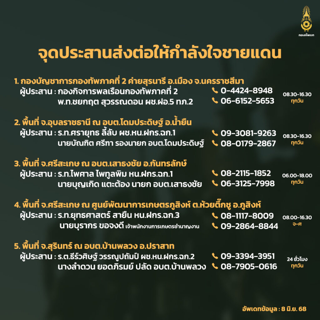 จุดประสานงานเพื่อส่งต่อความห่วงใยของประชาชน ในการแสดงออกและให้กำลังใจทหารปฏิบัติงานตามแนวชายแดนไทย-กัมพูชา