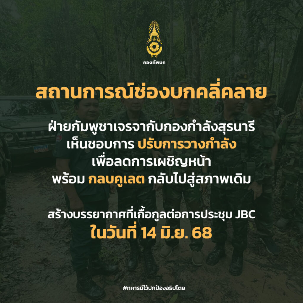 ทหารกัมพูชา ถอนกำลังแล้ว พร้อมปิดกลบคูเลต ให้อยู่ในสภาพเดิม พร้อมจัดเจ้าหน้าที่ทหารทั้ง 2 ฝ่าย มาพูดคุยสัปดาห์ละ 1 ครั้ง เพื่อสร้างบรรยากาศที่เกื้อกูลต่อการประชุม JBC ในวันที่ 14 มิถุนายน 2568