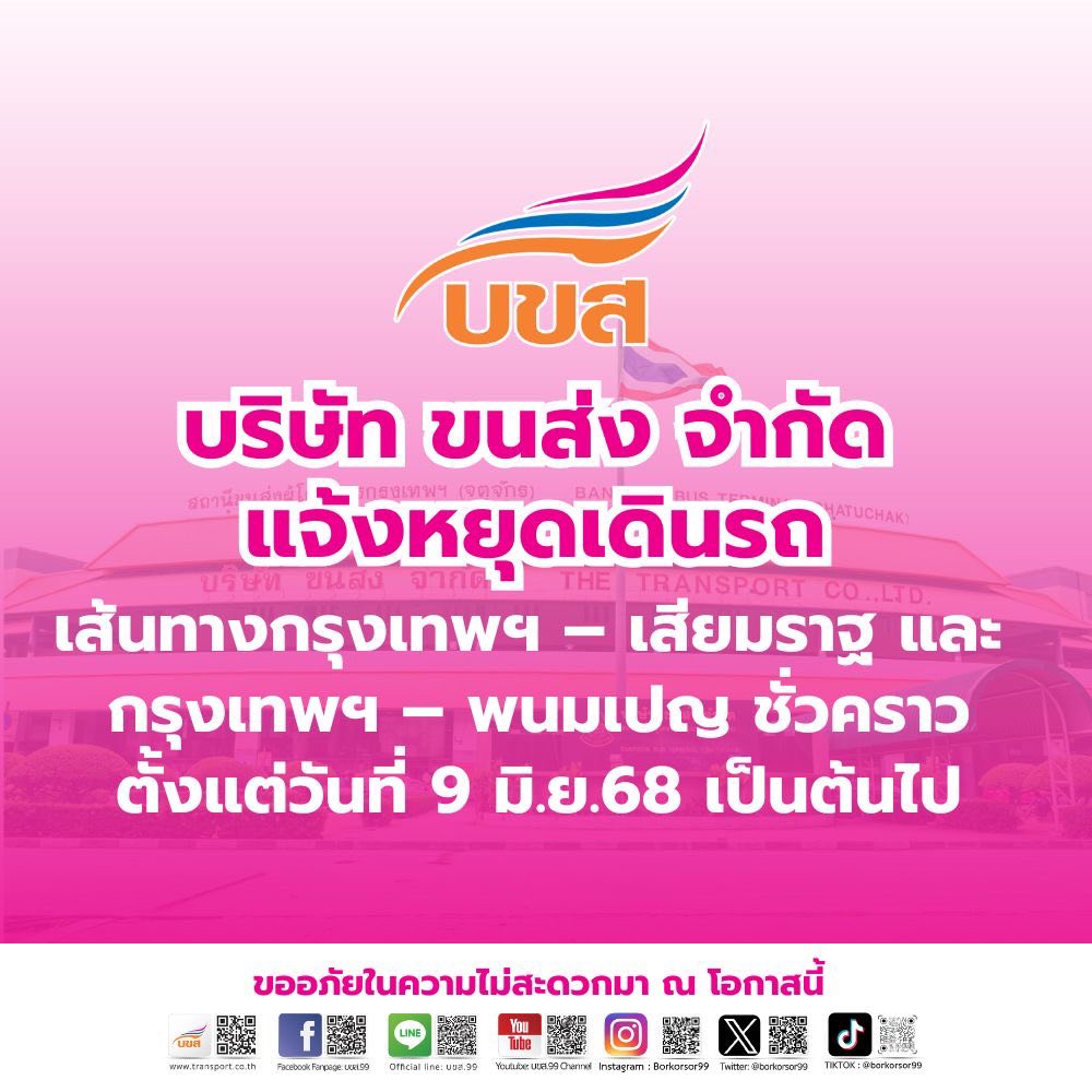 บริษัท ขนส่ง จำกัด (บขส.) แจ้งว่า บขส. ขอหยุดการเดินรถเส้นทางระหว่างประเทศไทย – กัมพูชา จำนวน 2 เส้นทาง คือ เส้นทางที่ 12 กรุงเทพฯ – เสียมราฐ และ เส้นทางที่ 13 กรุงเทพฯ – พนมเปญ เป็นการชั่วคราว ตั้งแต่วันที่ 9 มิถุนายน 2568 เป็นต้นไป เนื่องจากมีการห้ามรถโดยสารข้ามจุดผ่านแดนฯ ระหว่างประเทศไทย และกัมพูชา ชั่วคราว ทั้งนี้ บขส. ขออภัยในความไม่สะดวก และหากมีความคืบหน้าจะแจ้งให้ทราบต่อไป