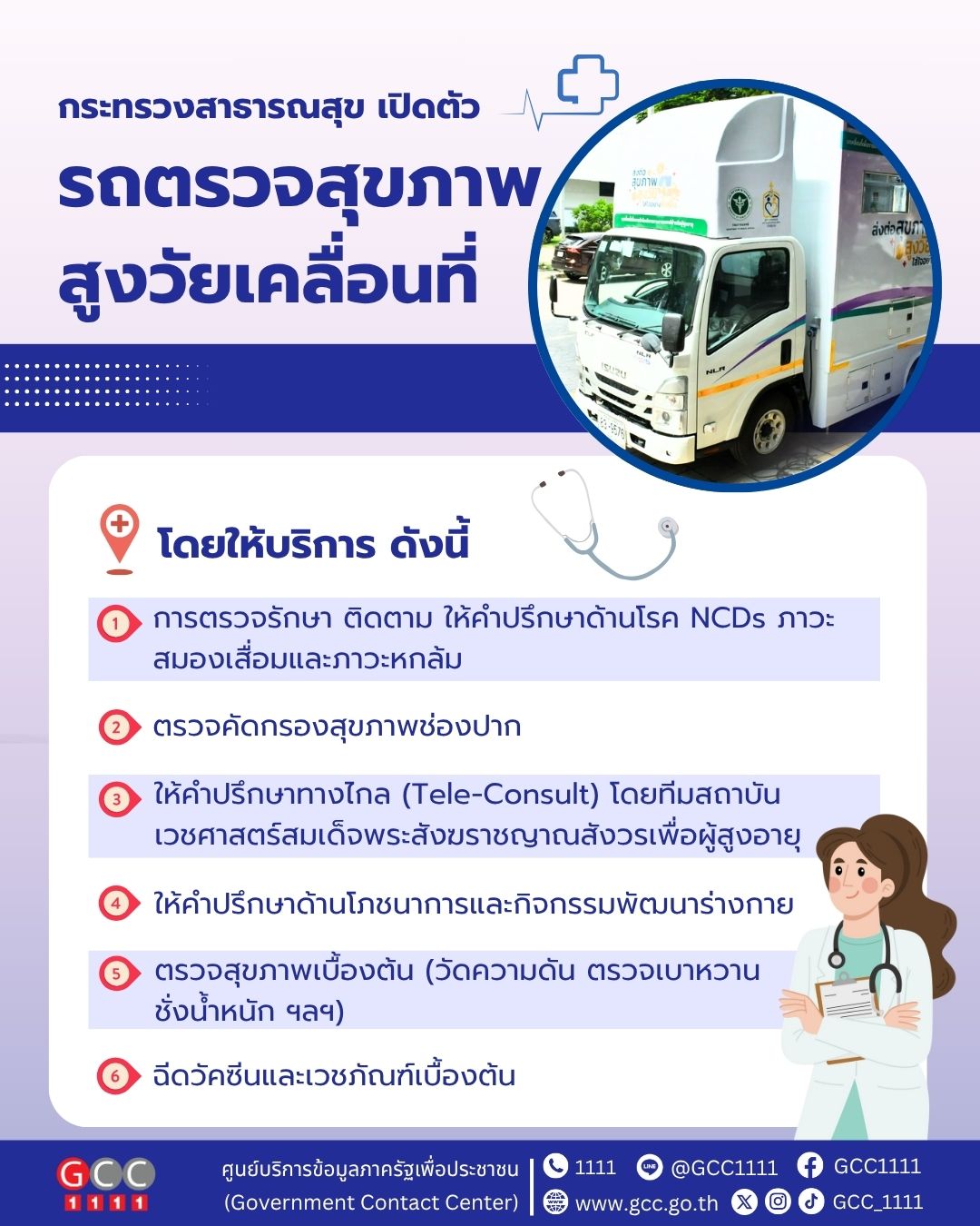 กระทรวงสาธารณสุข เปิดตัว “รถตรวจสุขภาพสูงวัยเคลื่อนที่” ซึ่งเป็นนวัตกรรมเชิงรุกเพื่อเพิ่มการเข้าถึงบริการสาธารณสุขของผู้สูงอายุ โดยเฉพาะในพื้นที่ห่างไกล รองรับผู้ใช้บริการได้ถึงปีละ 21,600 คน หรือคิดเป็น 12% ของกลุ่มเป้าหมาย