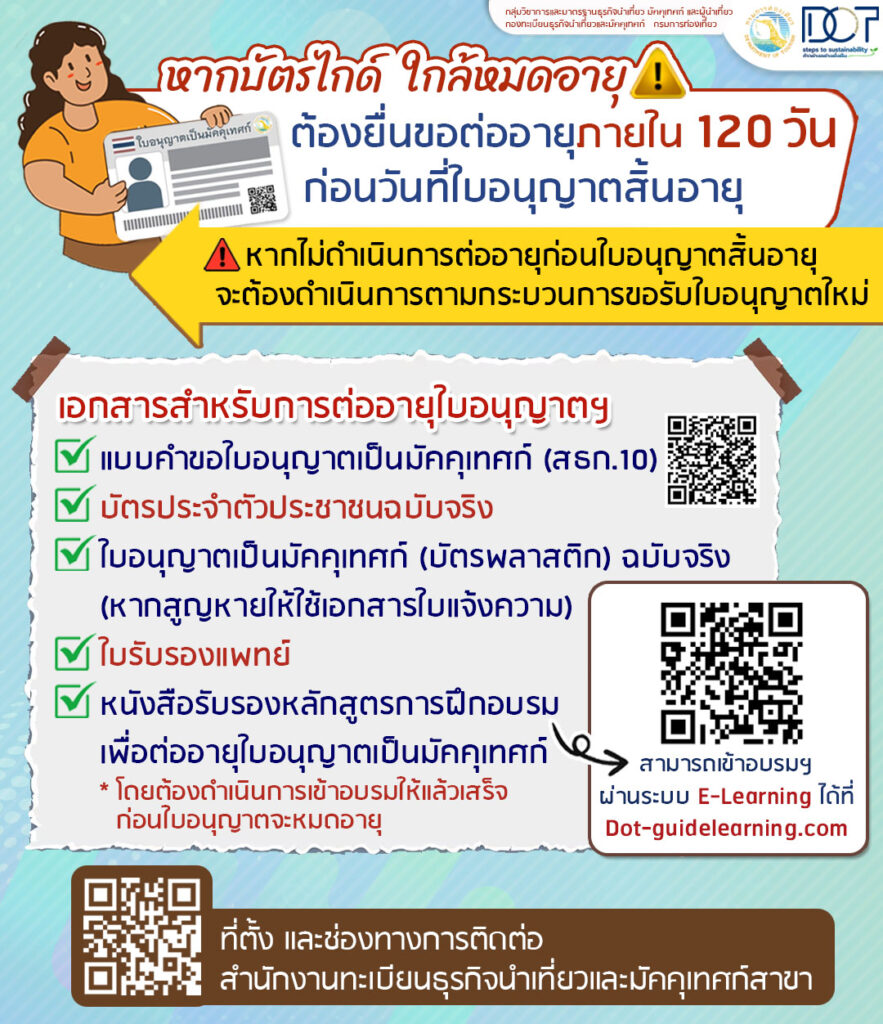 กรมการท่องเที่ยว แนะนำต้องยื่นขอต่ออายุใบอนุญาตเป็นมัคคุเทศก์ ภายใน 120 วัน ก่อนวันที่ใบอนุญาตสิ้นอายุ (หากไม่ดำเนินการต่ออายุก่อนใบอนุญาตสิ้นอายุ จะต้องดำเนินการตามกระบวนการขอรับใบอนุญาตใหม่)