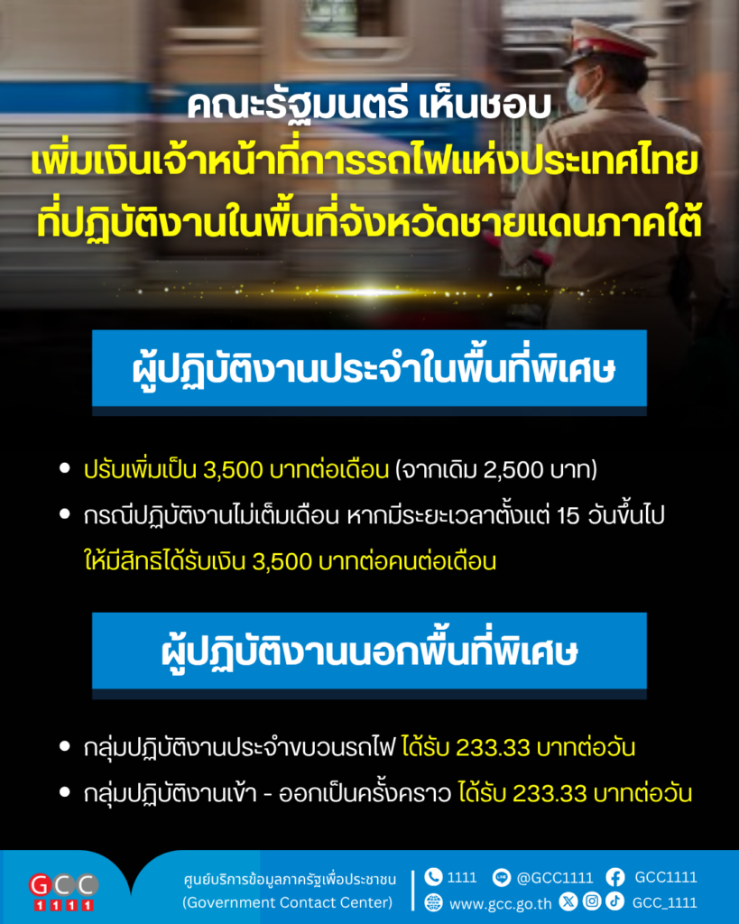 คณะรัฐมนตรี มีมติเห็นชอบให้การรถไฟแห่งประเทศไทย ปรับเพิ่มเงินสวัสดิการพิเศษ แก่เจ้าหน้าที่ที่ปฏิบัติงานในพื้นที่เสี่ยงภัยจังหวัดชายแดนภาคใต้
