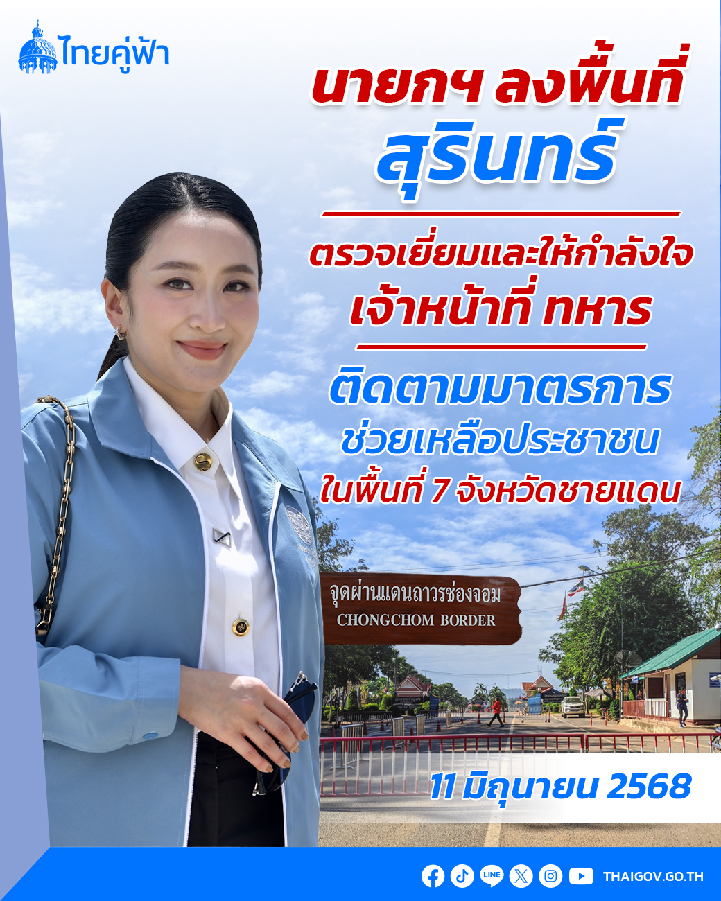นายกรัฐมนตรี มีกำหนดการลงพื้นที่ชายแดนไทยกัมพูชา ณ จุดผ่านแดนถาวรช่องจอม จ.สุรินทร์ วันที่ 11 มิ.ย. 68