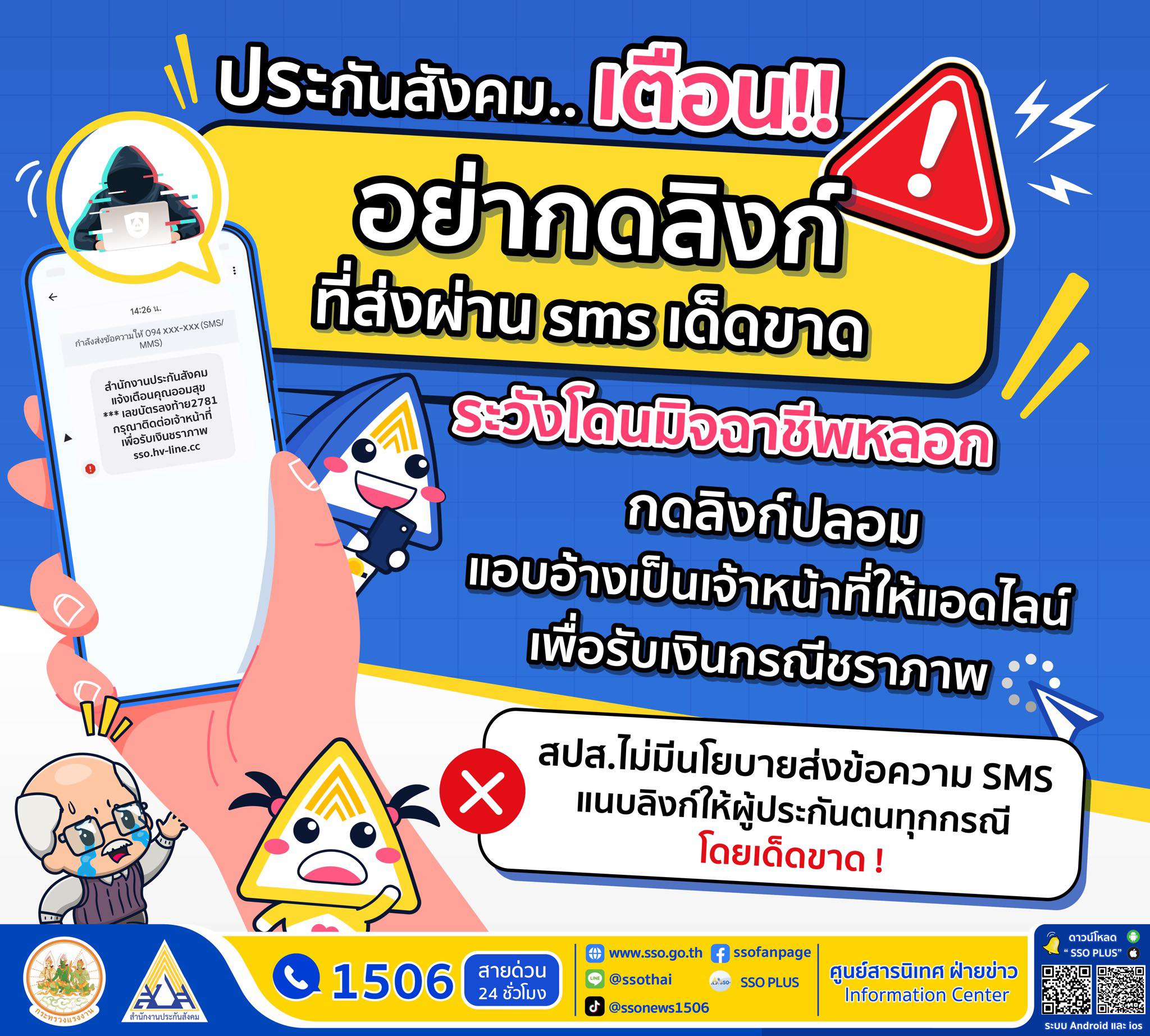 จึงขอแจ้งเตือนผู้ประกันตนหรือประชาชนทุกคน ไม่ควรหลงเชื่อข้อมูลที่ได้รับจากโทรศัพท์เพียงอย่างเดียว ควรติดต่อสอบถามสำนักงานประกันสังคมโดยตรง อีกทั้งผู้ประกันตนไม่ควรให้ข้อมูลทางการเงินข้อมูลส่วนบุคคล ข้อมูลการทำธุรกรรมออนไลน์ รหัส OTP ที่ได้รับผ่าน SMS และที่สำคัญอย่าหลงโอนเงินตามคำบอกของมิจฉาชีพโดยเด็ดขาด