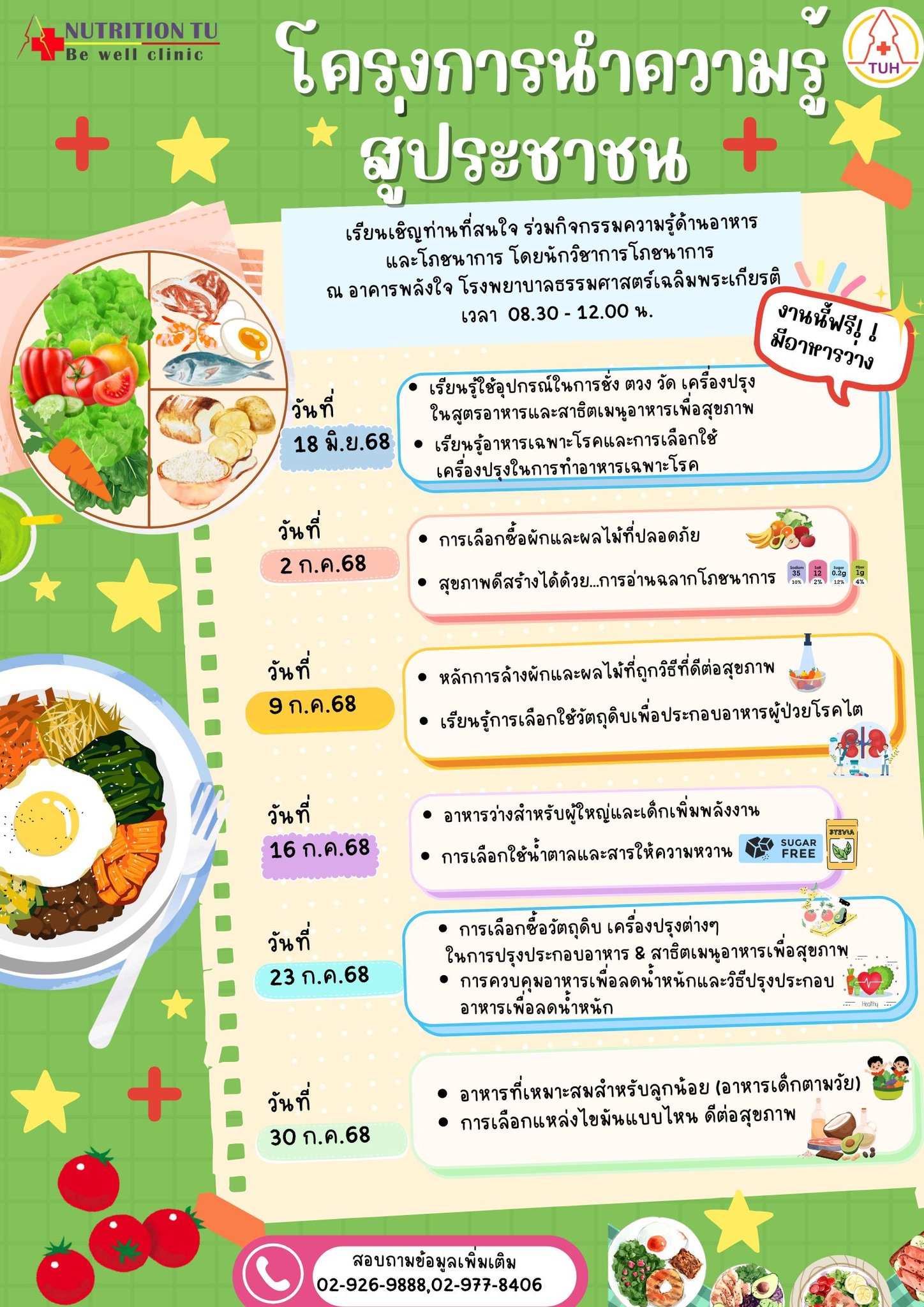 โรงพยาบาลธรรมศาสตร์เฉลิมพระเกียรติ ขอชวนทุกท่านมาเรียนรู้เรื่องอาหารเพื่อสุขภาพ กับ โครงการนำความรู้สู่ประชาชน โดย ทีมโภชนาการ โรงพยาบาลธรรมศาสตร์เฉลิมพระเกียรติ ที่จัดขึ้นเพื่อส่งเสริมให้ทุกคนเข้าถึงความรู้ด้านโภชนาการ นำไปปรับใช้ในการดูแลตนเองและคนที่คุณรักได้อย่างถูกต้องและปลอดภัย