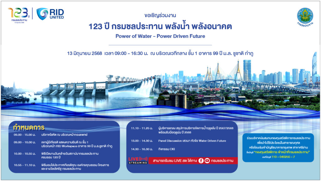 กรมชลประทาน ขอเชิญร่วมงาน 123 ปี กรมชลประทาน พลังน้ำ พลังอนาคต Power of Water – Power Driven Future วันศุกร์ที่ 13 มิถุนายน 2568 เวลา 09.00 – 16.30 น. ณ บริเวณเวทีกลาง ชั้น 1 อาคาร 99 ปี ม.ล. ชูชาติ กำภู ถ่ายทอดสด ผ่านช่องทาง Facebook กรมชลประทาน และ Youtube กรมชลประทาน