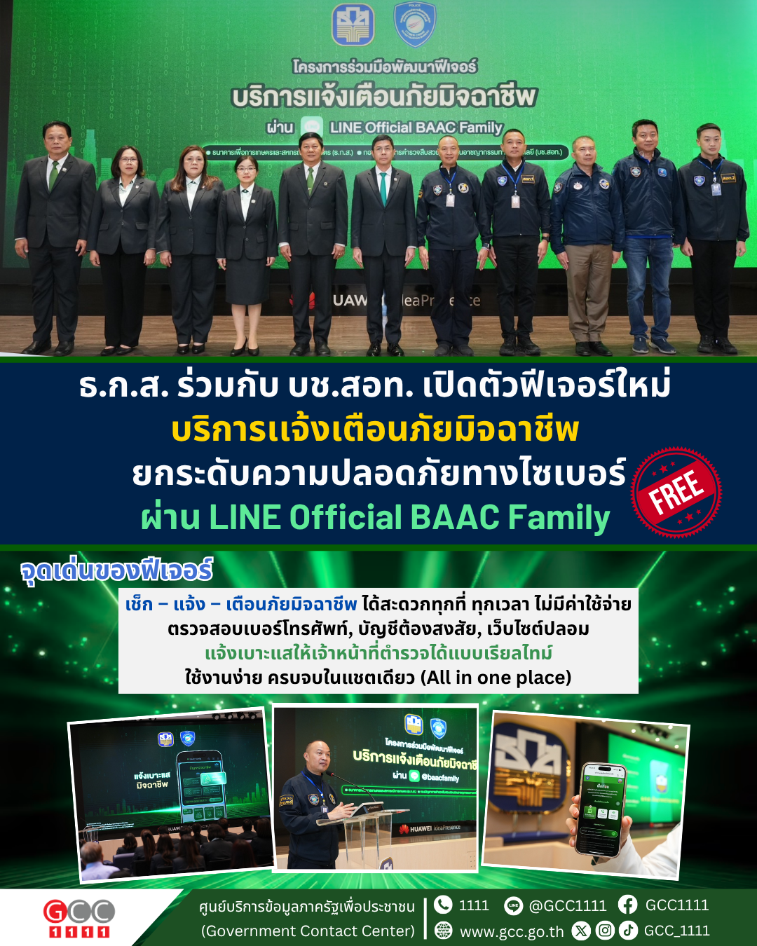 ธ.ก.ส. จับมือ บช.สอท. เดินหน้าเสริมแกร่งความปลอดภัยทางไซเบอร์ให้กับประชาชนทั่วประเทศ เปิดตัวฟีเจอร์ใหม่ “บริการแจ้งเตือนภัยมิจฉาชีพ” บน LINE Official BAAC Family โดยสามารถเช็ก – แจ้ง – เตือนภัยมิจฉาชีพได้สะดวกทุกที่ ทุกเวลา ผ่าน LINE Official BAAC Family โดยไม่มีค่าใช้จ่าย พร้อมเดินหน้าขับเคลื่อนการสร้างภูมิคุ้มกันด้วยการสนับสนุนความรู้ภัยไซเบอร์ให้กับประชาชนในวงกว้าง