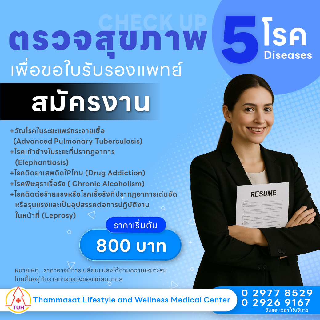 กำลังจะสมัครงานใช่ไหม อย่าลืม ต้องมีใบรับรองแพทย์ด้วยนะ มาที่ Thammasat Lifestyle and Wellness Medical Center ตรวจสุขภาพ 5 โรคต้องห้ามให้ครบ จบในที่เดียว